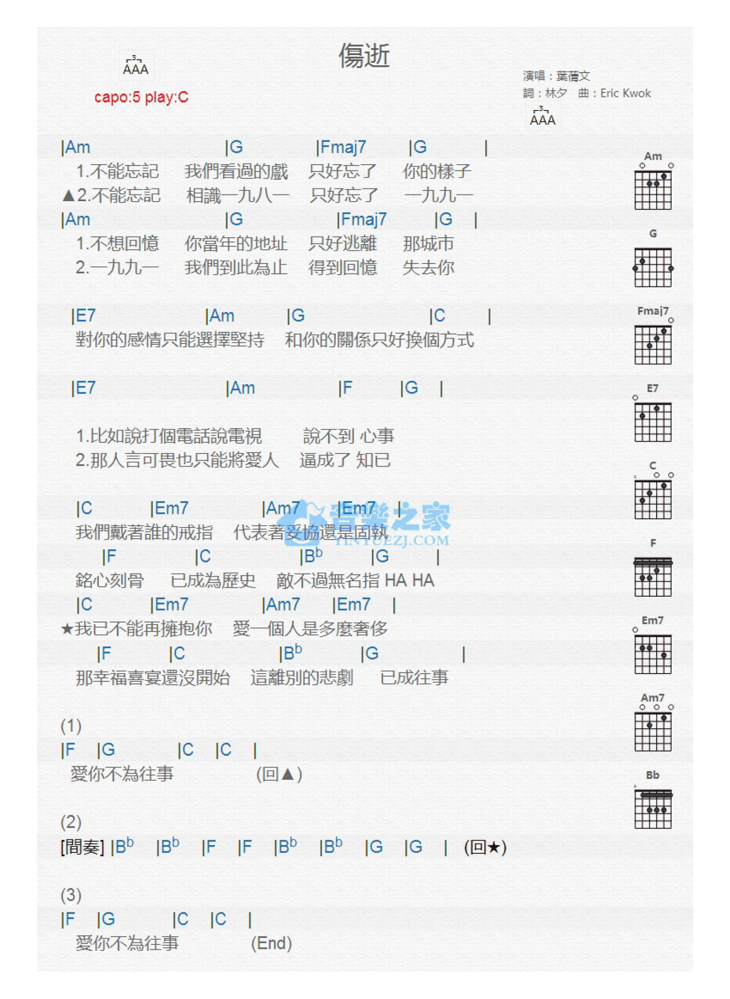 曲谱介绍: C调版 叶倩文《伤逝》吉他和弦弹唱谱