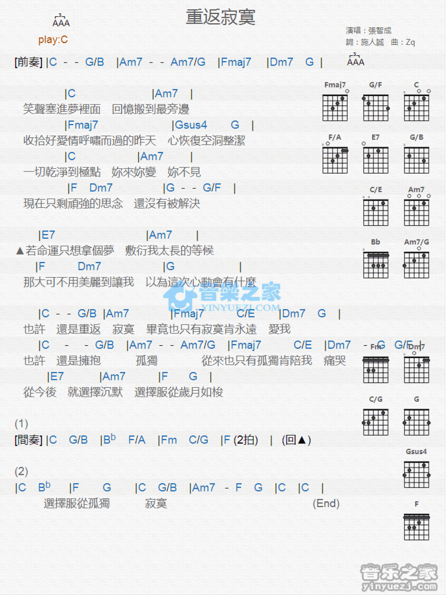 曲谱介绍: C调版 张智成《重返寂寞》吉他和弦弹唱谱
