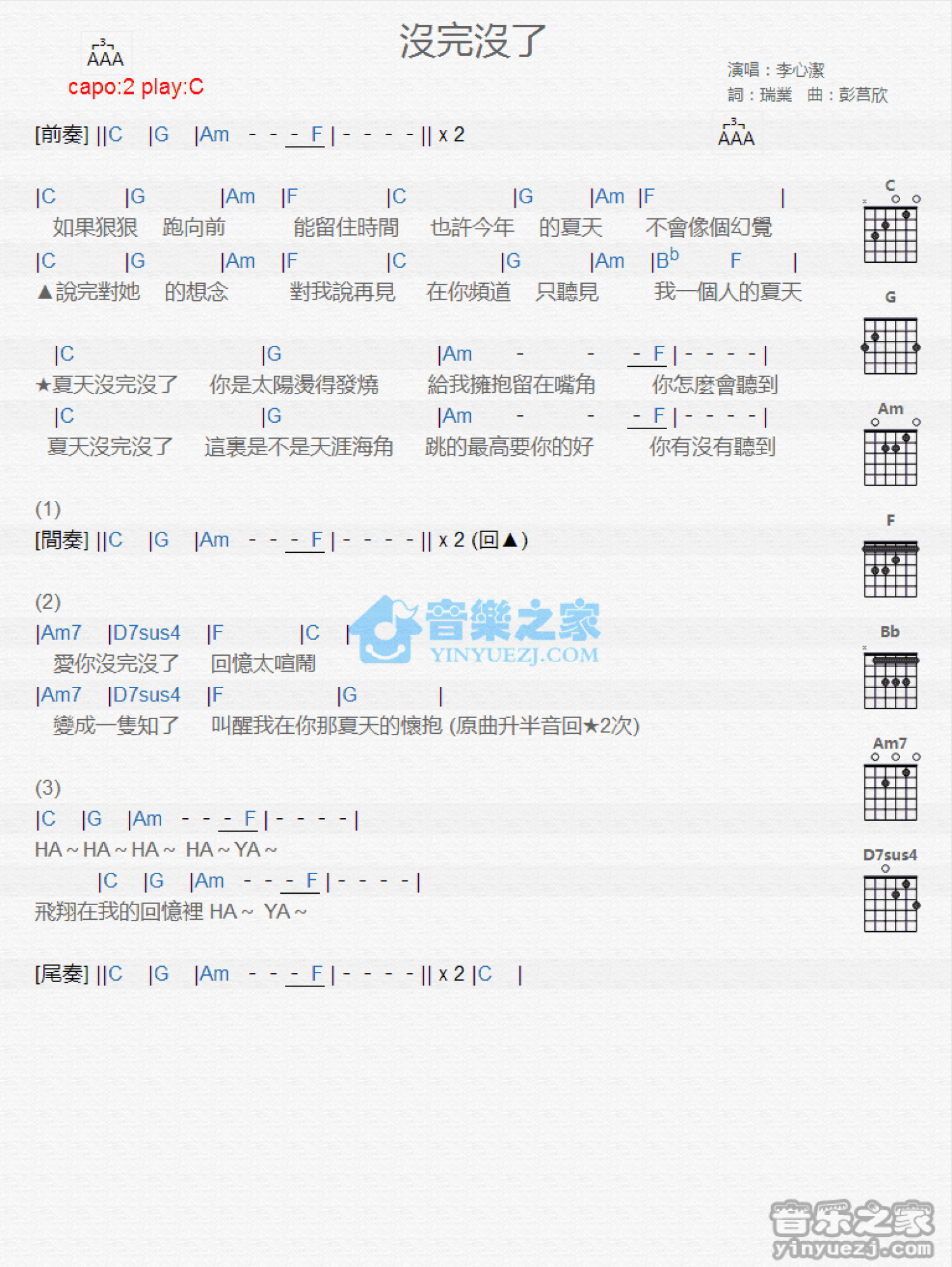 曲谱介绍: C调版《没完没了》吉他和弦弹唱谱