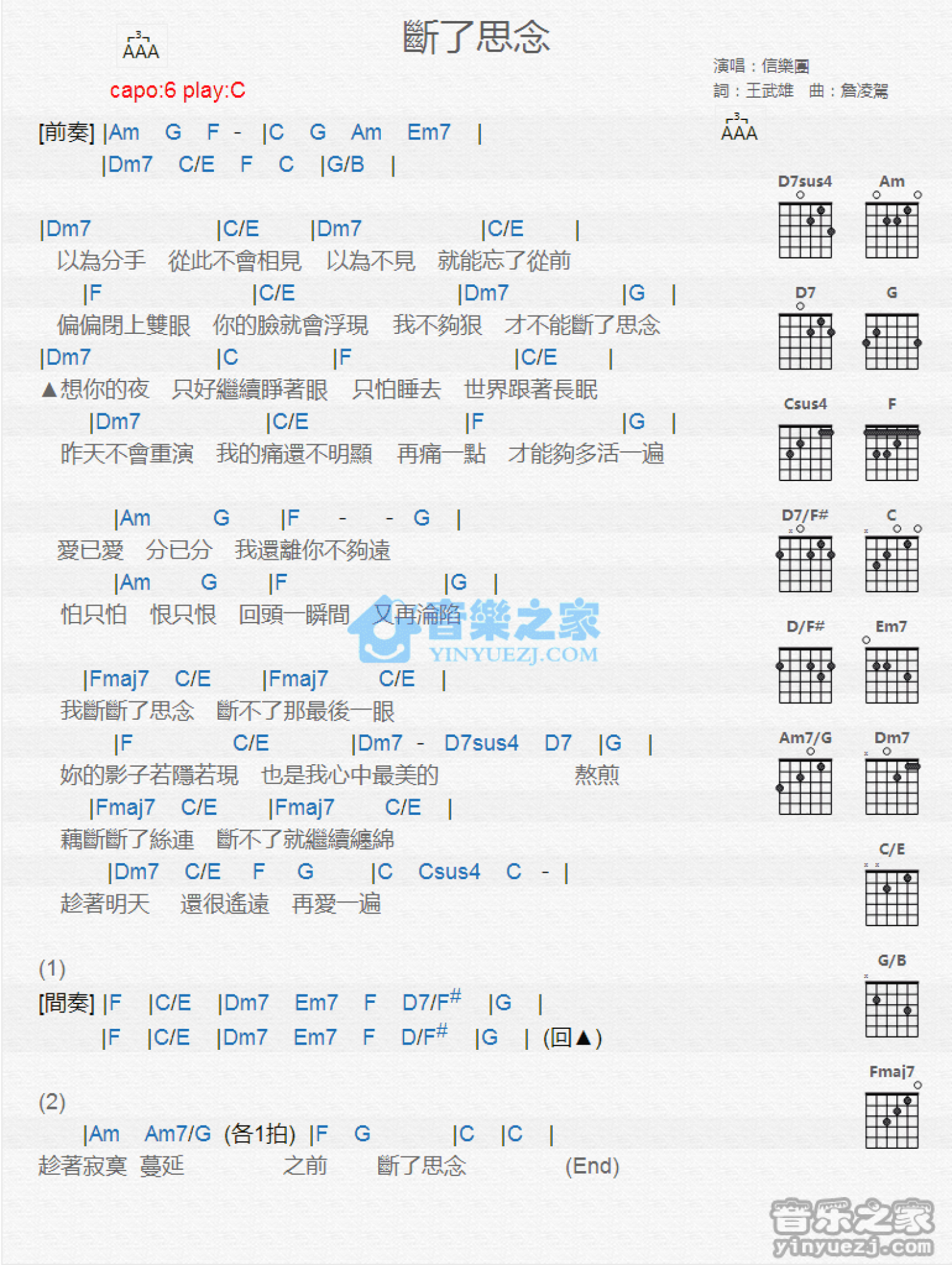 曲谱介绍: C调版信乐团《断了思念》吉他和弦弹唱谱