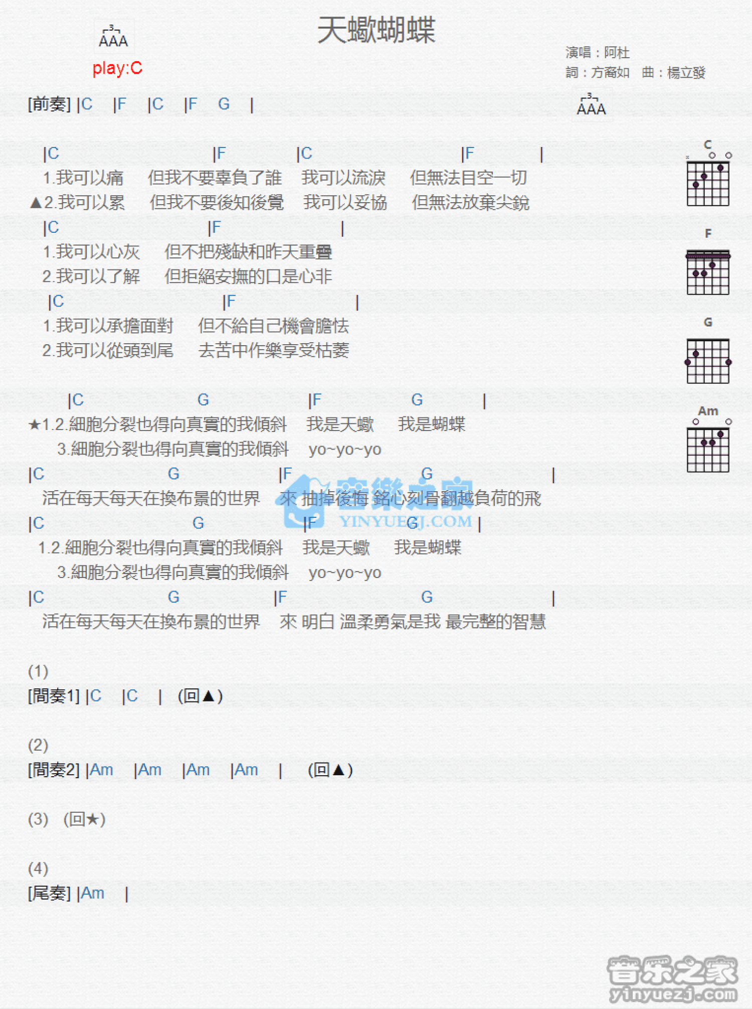 曲谱介绍: C调版《天蝎蝴蝶》吉他和弦弹唱谱