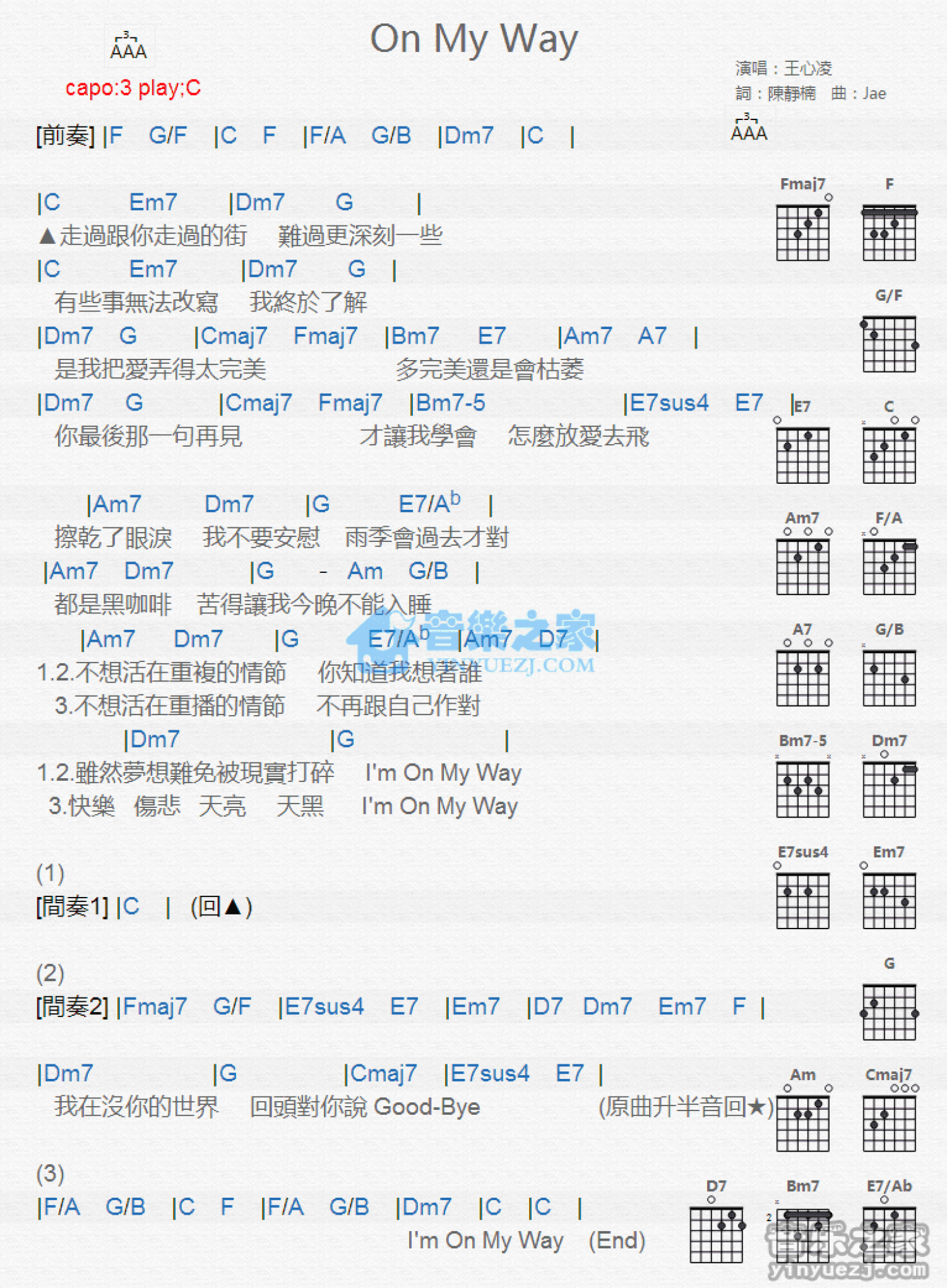 On My Way吉他谱 - 王心凌 - C调吉他弹唱谱 - 和弦谱