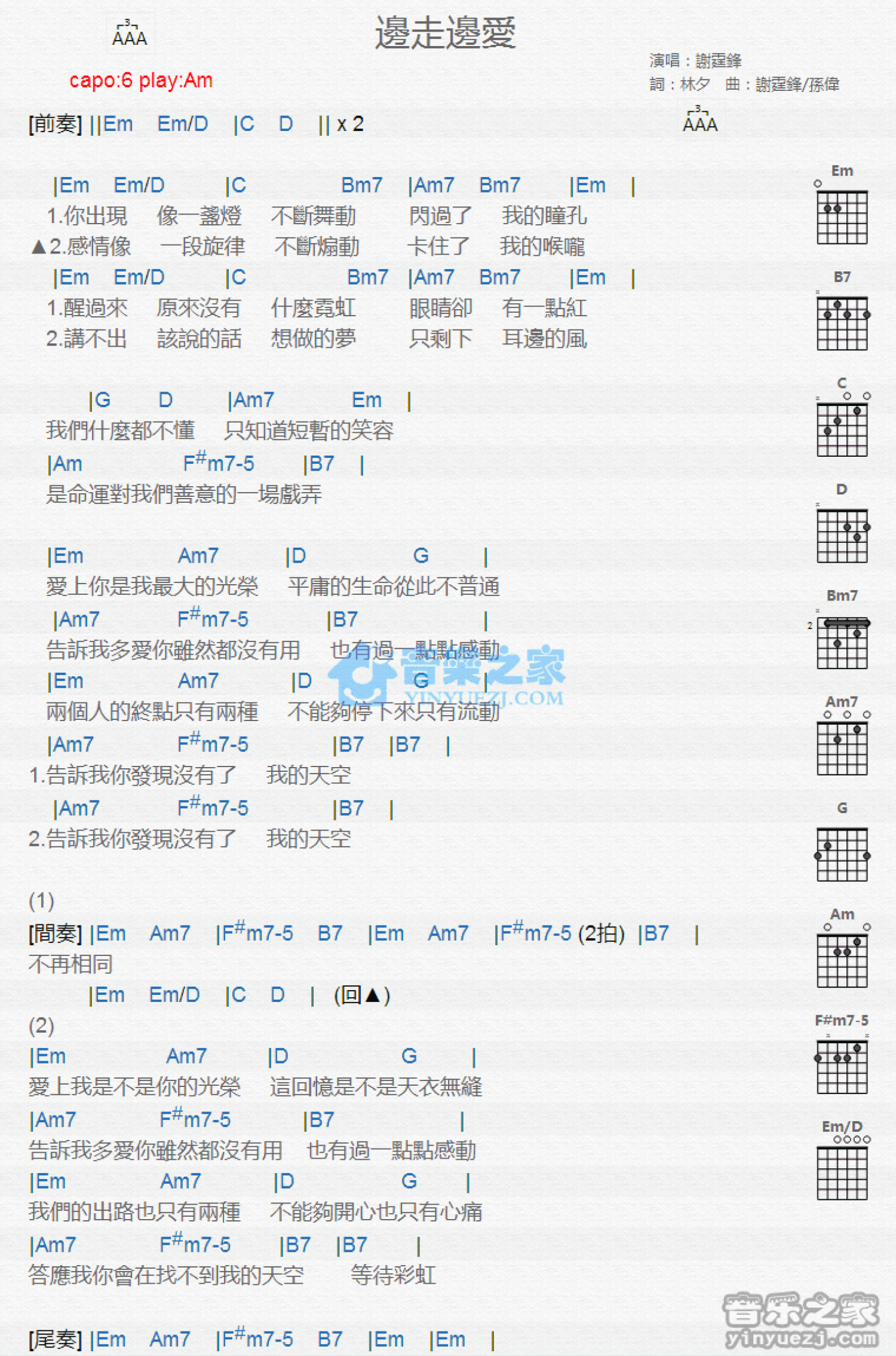 曲谱介绍: Am调版《边走边爱》吉他和弦弹唱谱