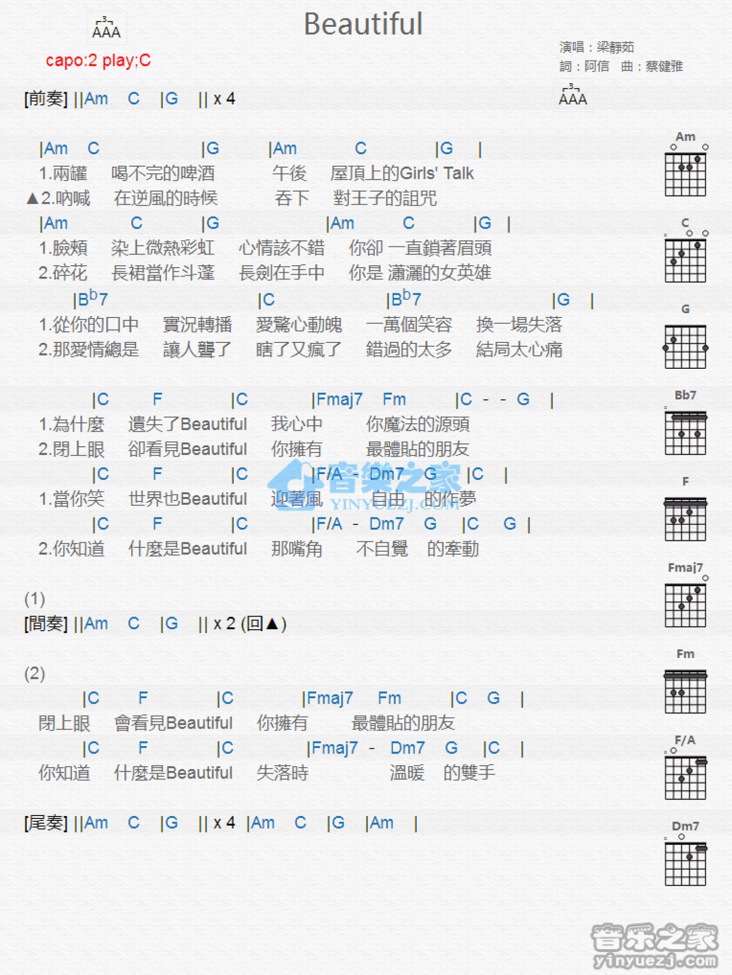 曲谱介绍: C调版《Beautiful》吉他和弦弹唱谱