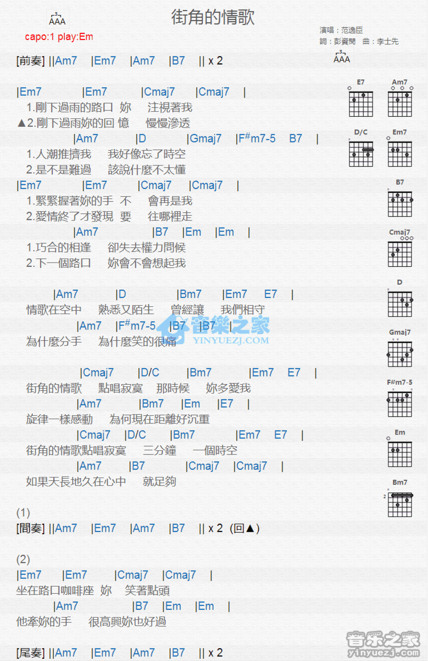 曲谱介绍: Em调版《街角的情歌》吉他和弦弹唱谱