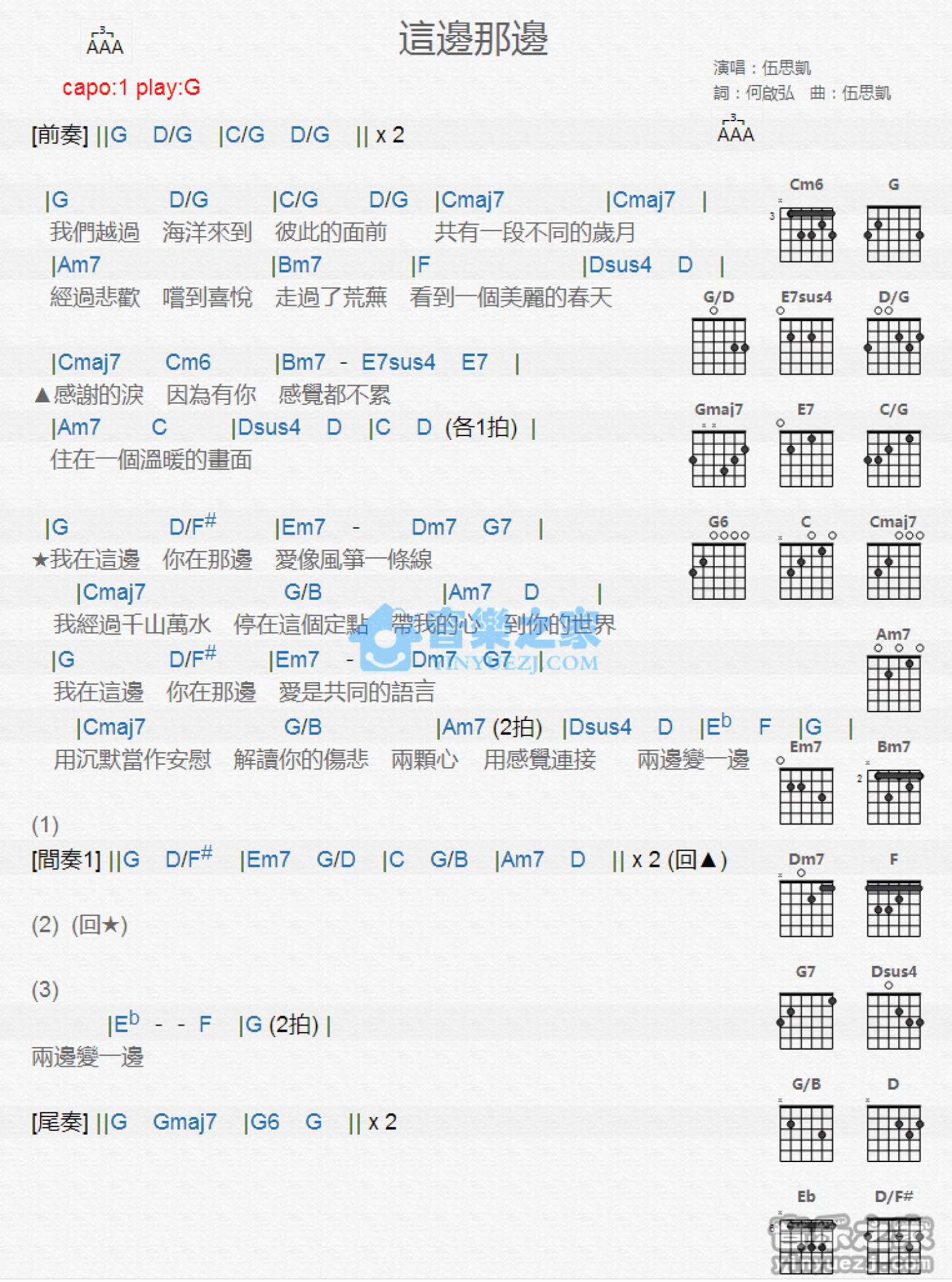 曲谱介绍: G调版《这边那边》吉他和弦弹唱谱