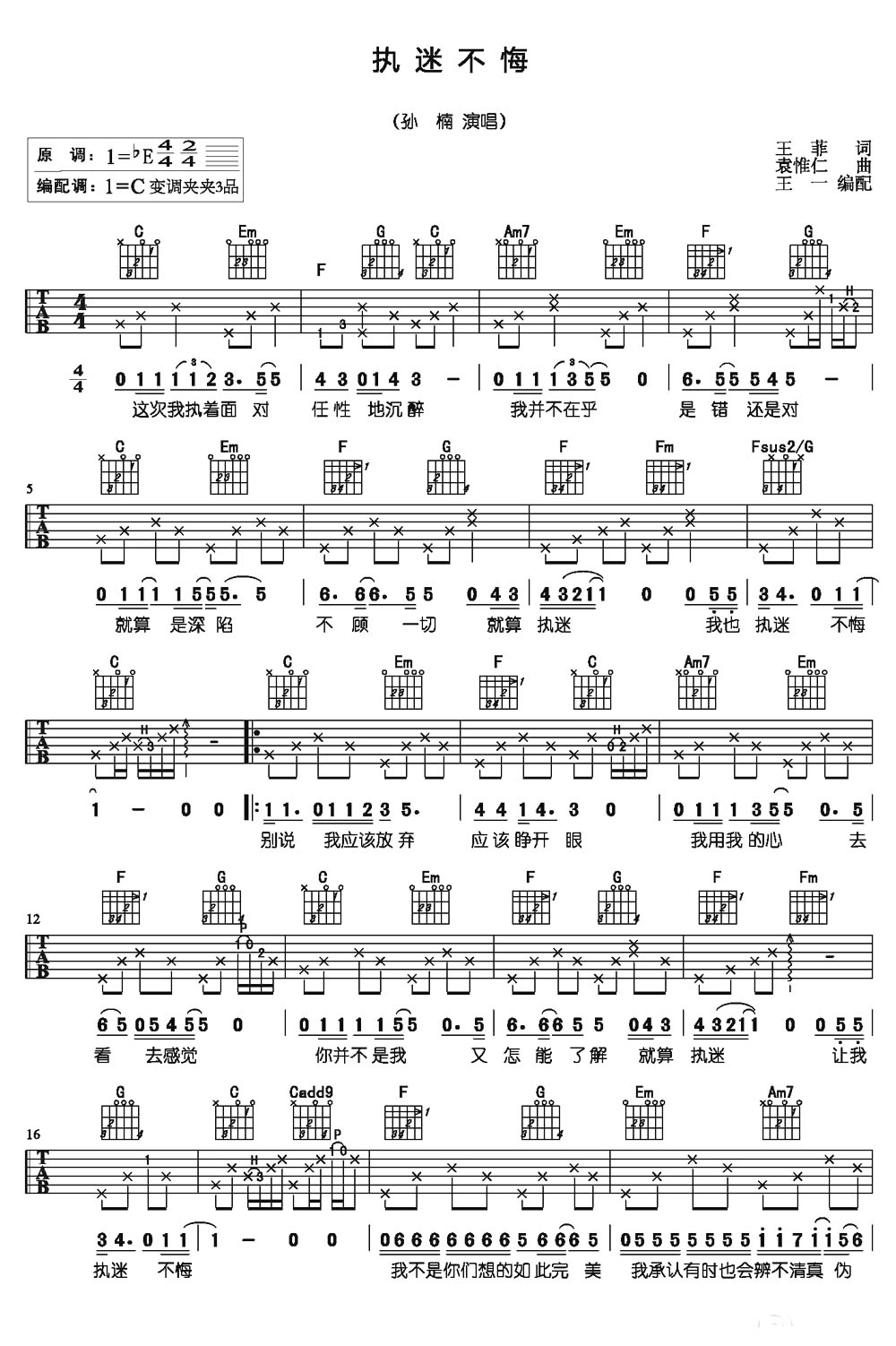 执迷不悔吉他谱 - 孙楠 - C调吉他弹唱谱