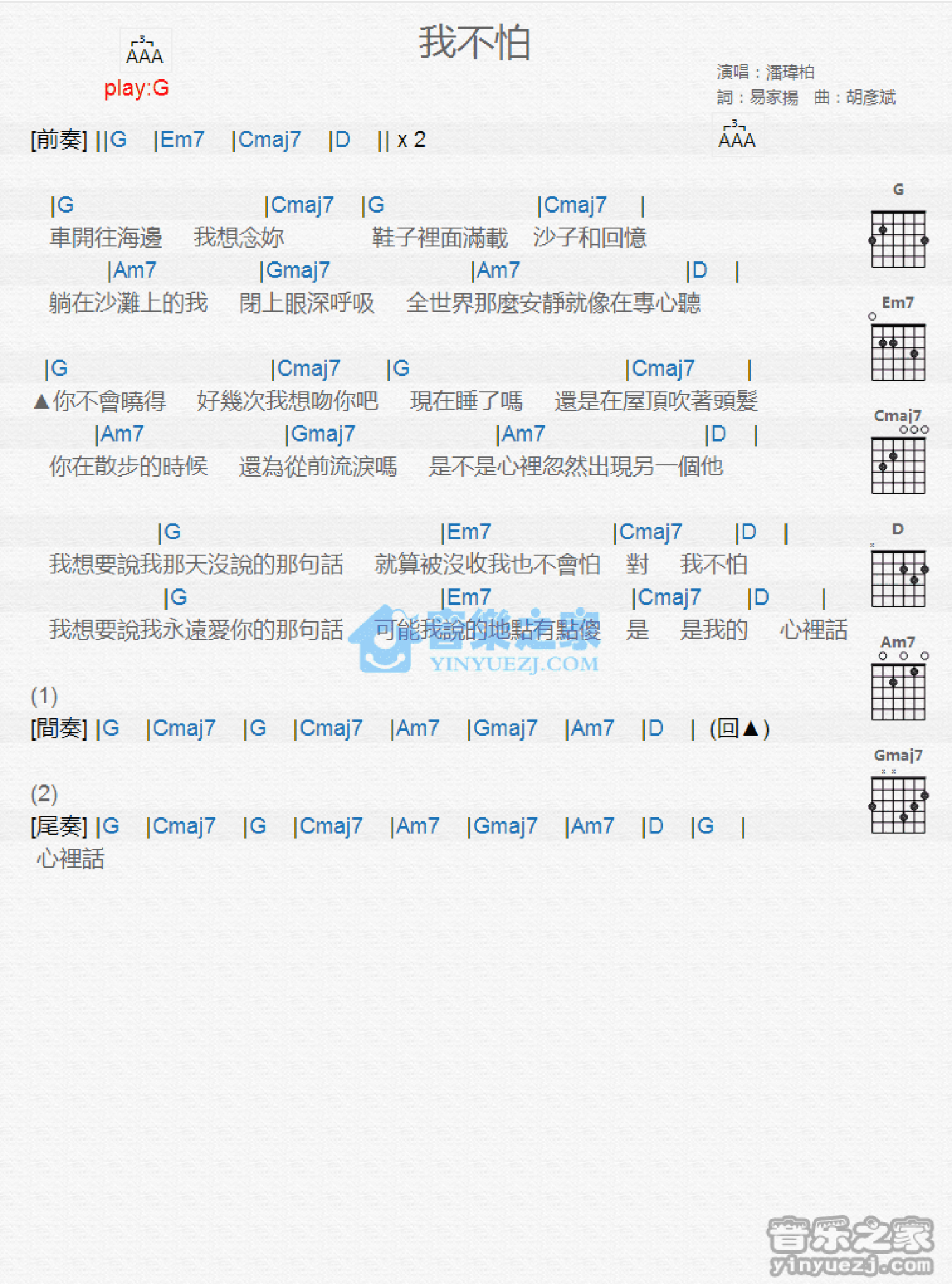曲谱介绍: G调版《我不怕》吉他和弦弹唱谱
