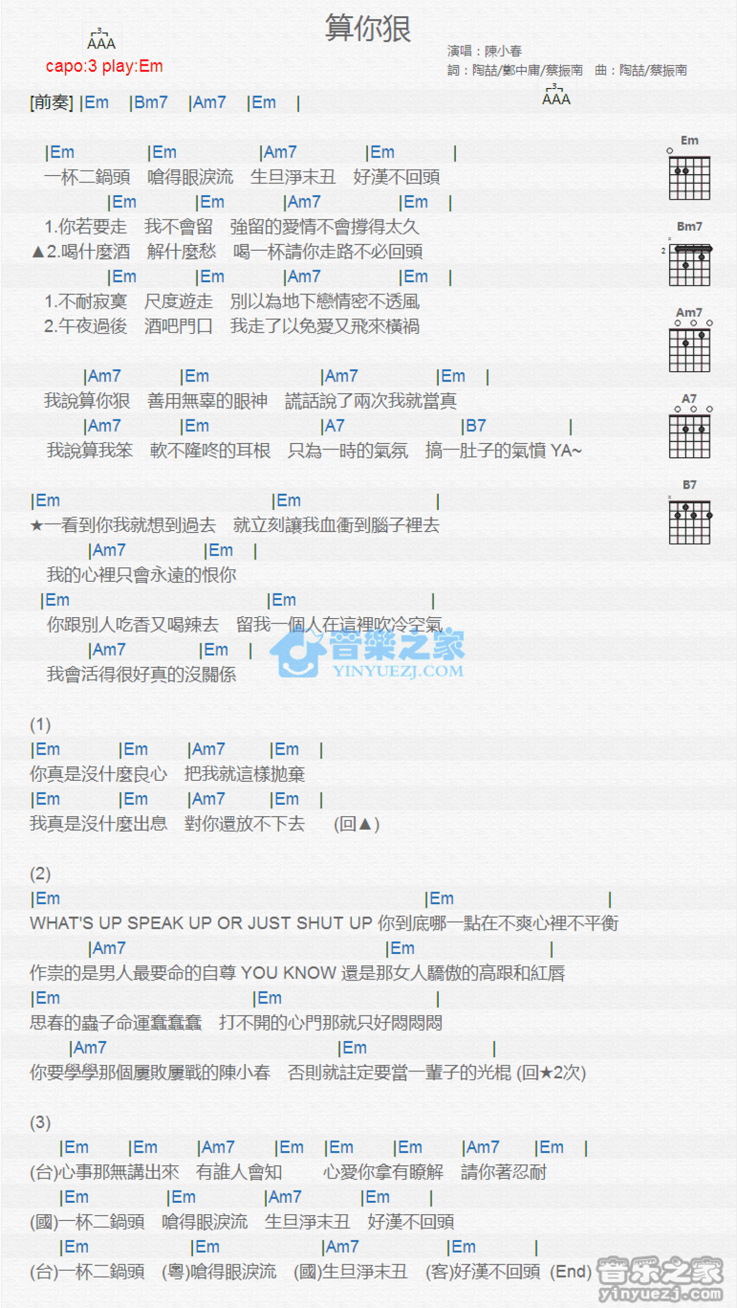 曲谱介绍: Em调版《算你狠》吉他和弦弹唱谱