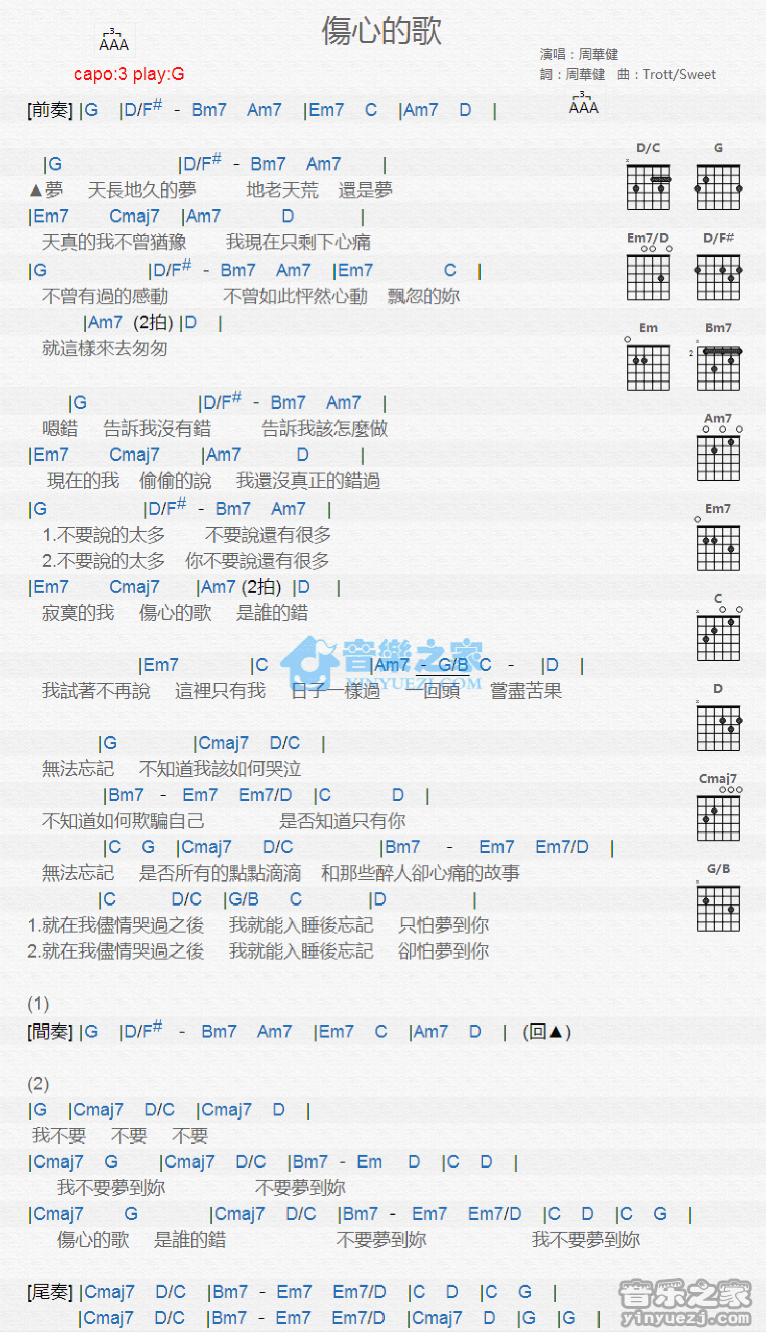 曲谱介绍: G调版 周华健《伤心的歌》吉他和弦弹唱谱