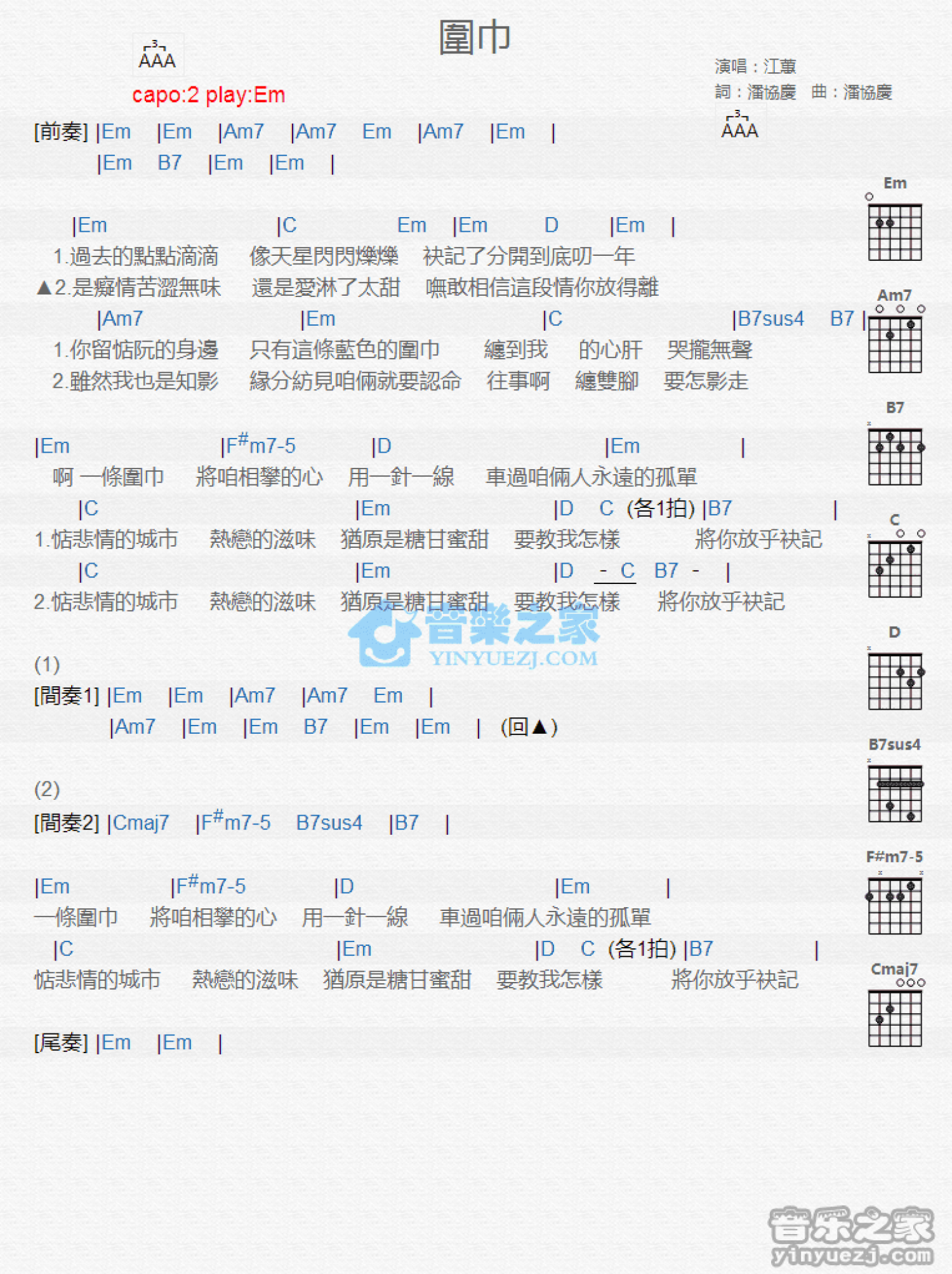 曲谱介绍: Em调版 江蕙《围巾》吉他和弦弹唱谱
