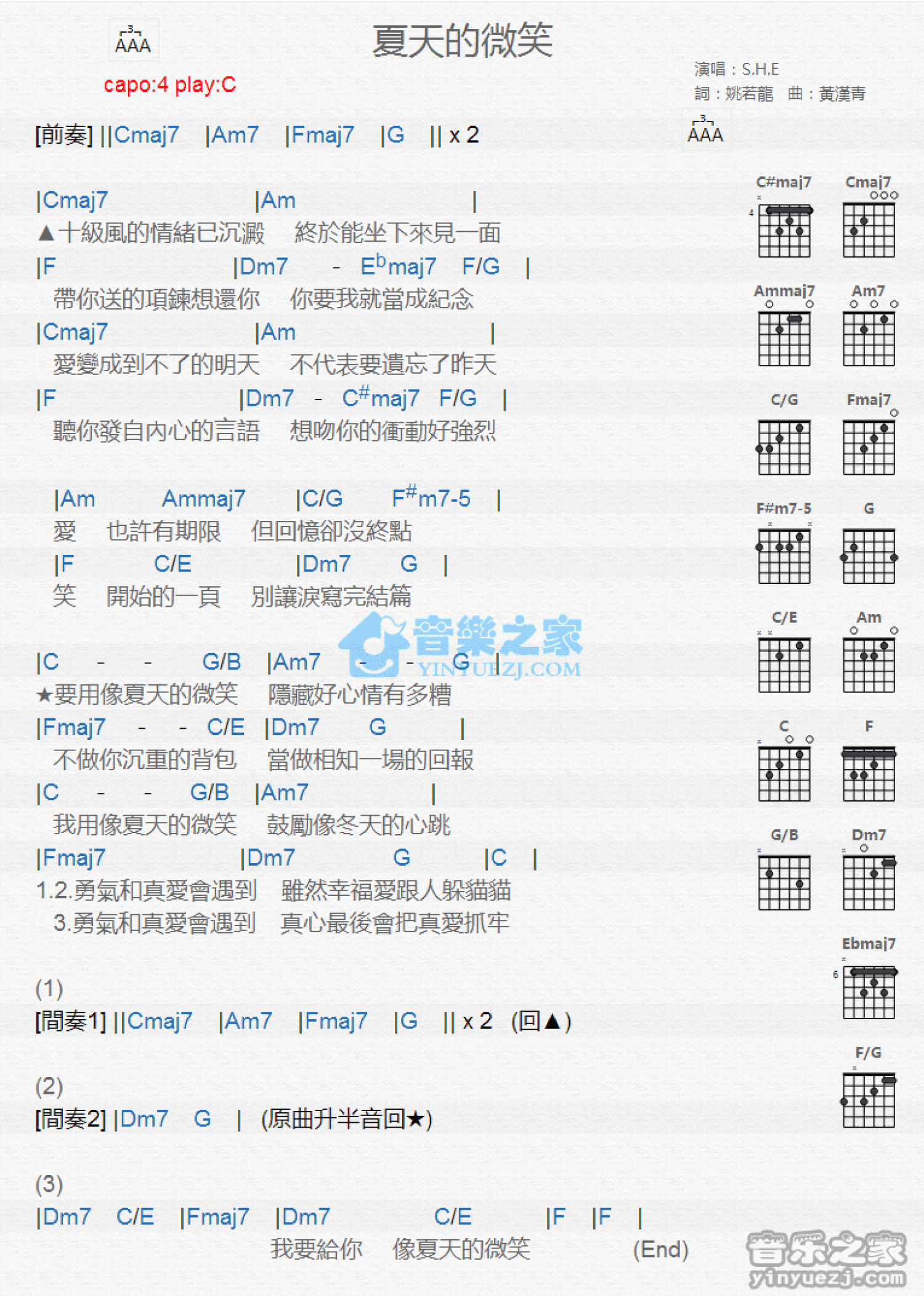 曲谱介绍: C调版 S.H.E《夏天的微笑》吉他和弦弹唱谱