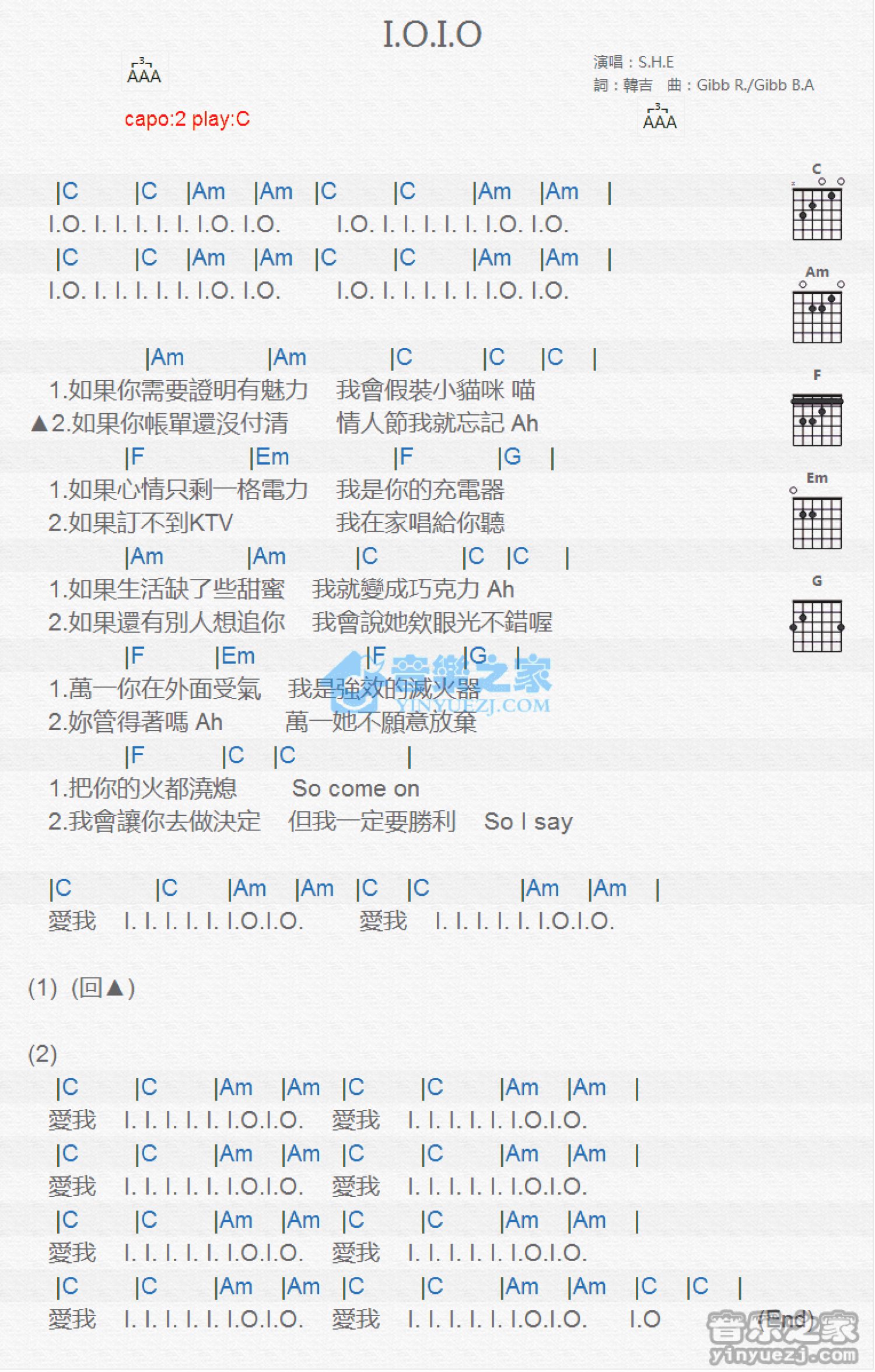 曲谱介绍: C调版 S.H.E《I.O.I.O》吉他和弦弹唱谱