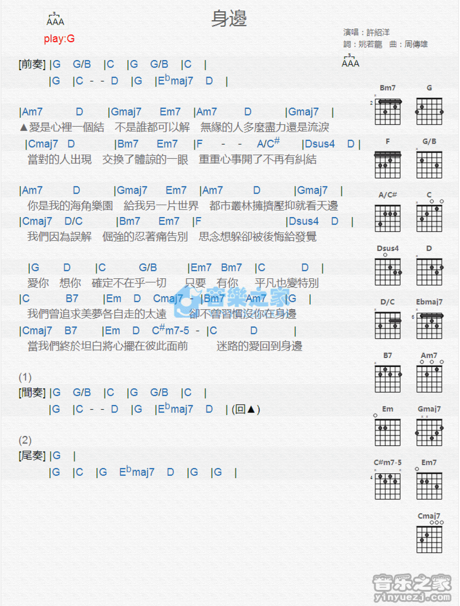 曲谱介绍: G调版 许绍洋《身边》吉他和弦弹唱谱
