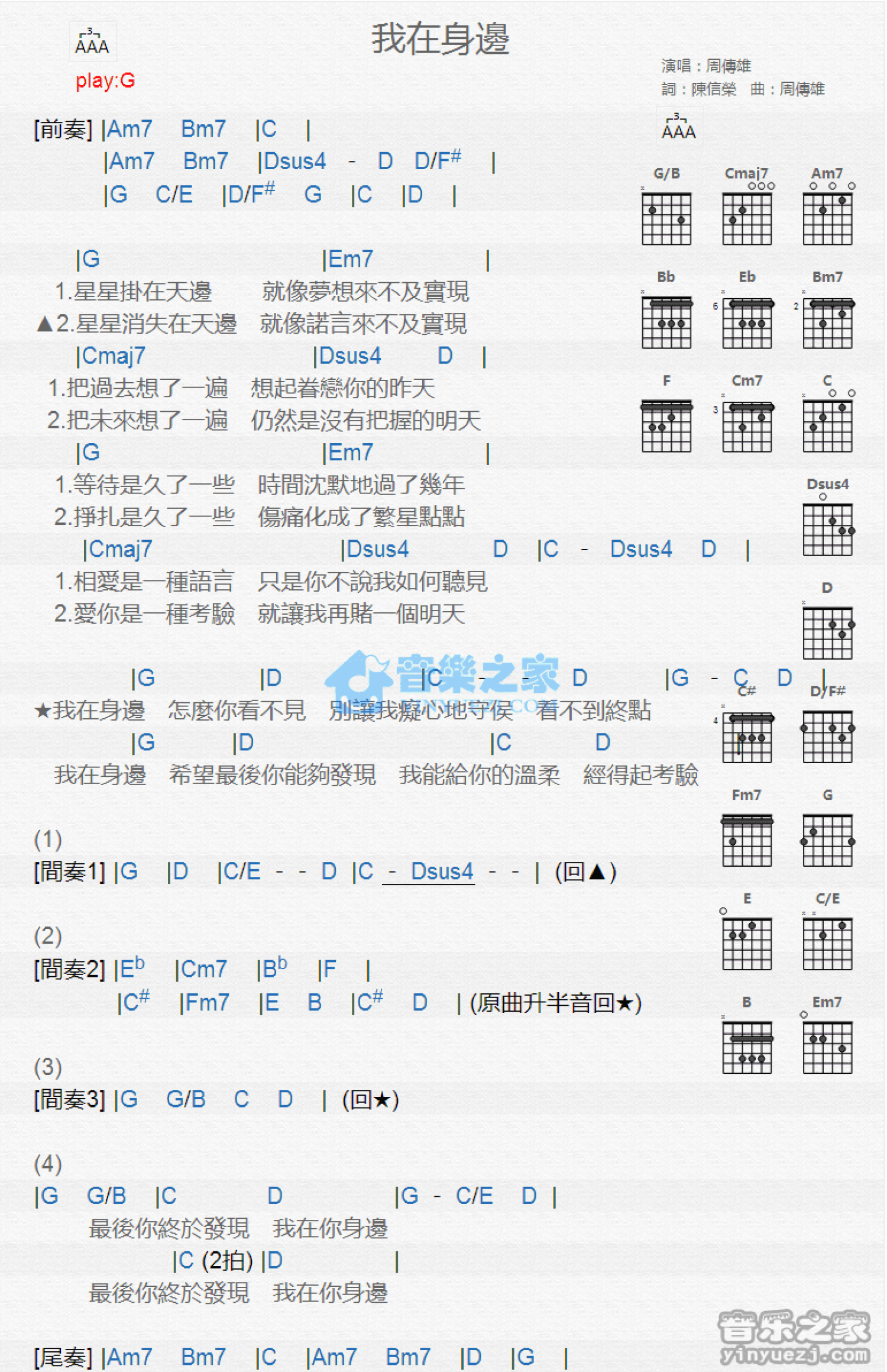 曲谱介绍: G调版 周传雄《我在身边》吉他和弦弹唱谱