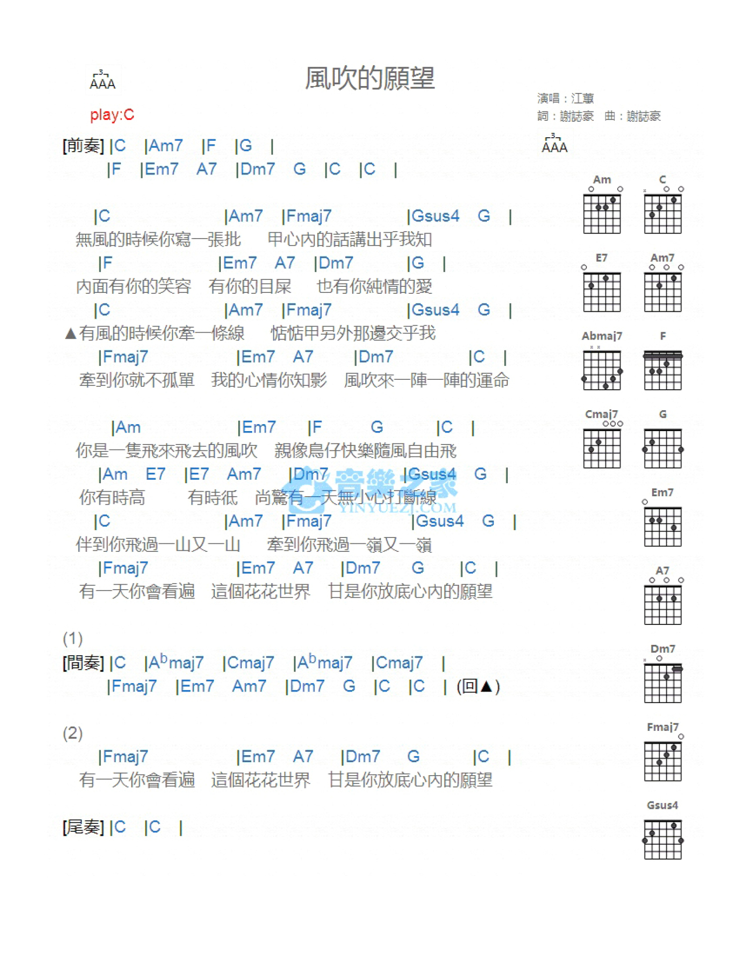 曲谱介绍: C调版 江蕙《风吹的愿望》吉他和弦弹唱谱
