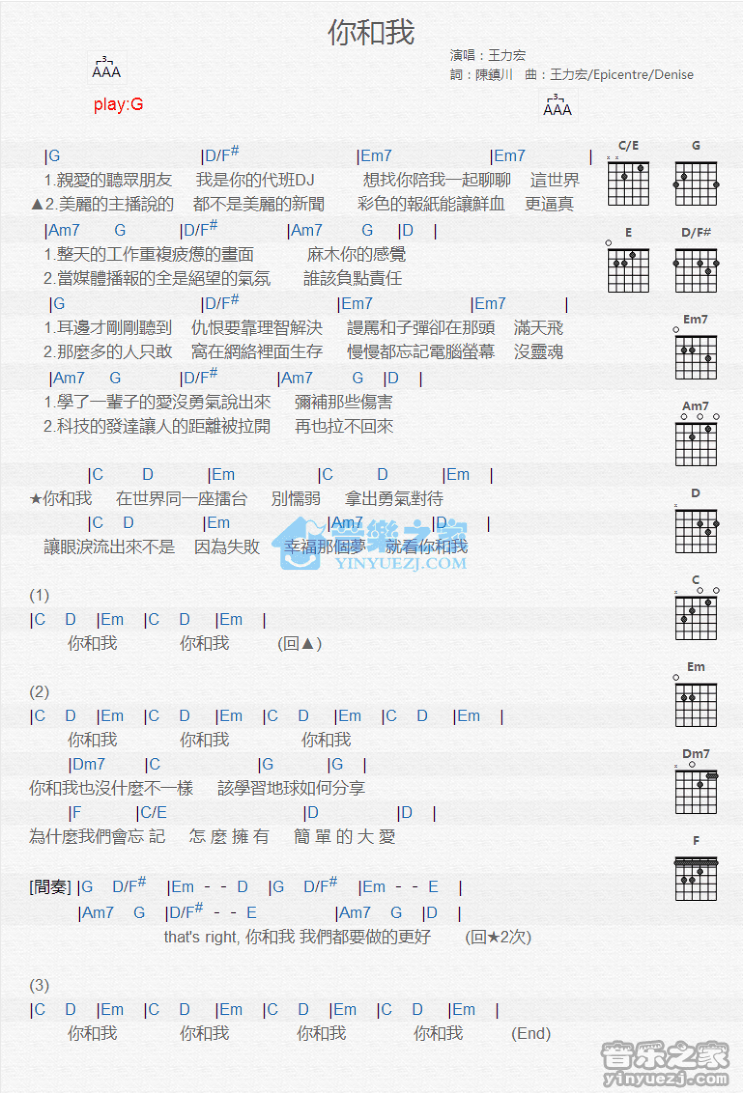 曲谱介绍: G调版 王力宏《你和我》吉他和弦弹唱谱