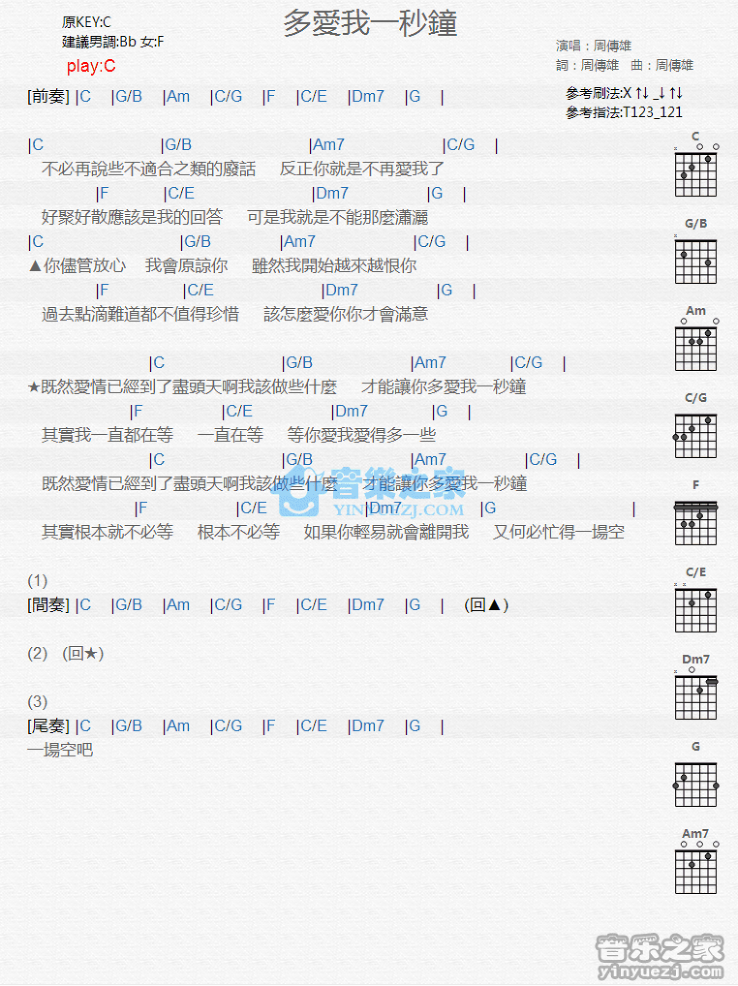 曲谱介绍: C调版 周传雄《多爱我一秒钟》吉他和弦弹唱谱