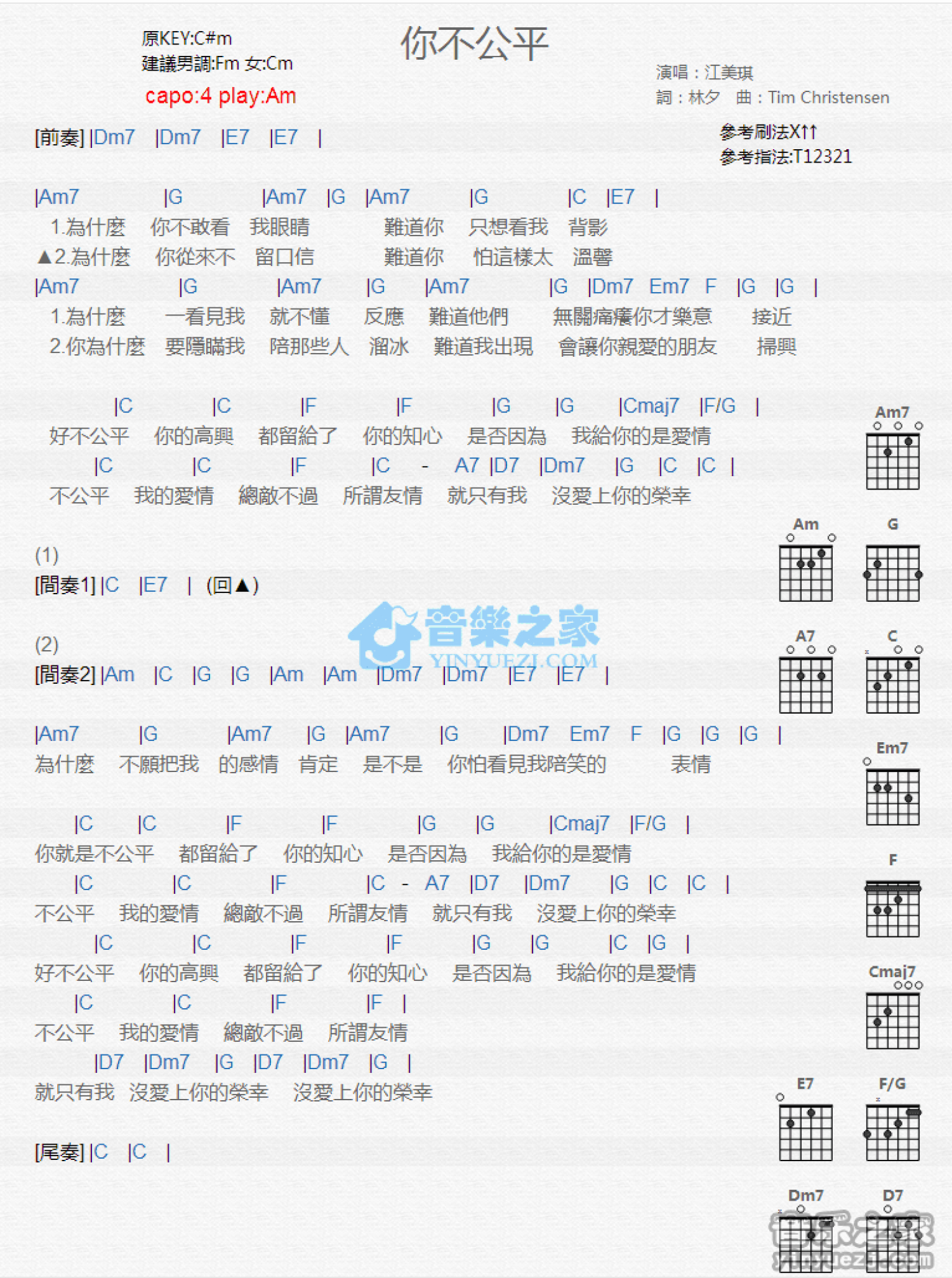 曲谱介绍: Am调版 江美琪《你不公平》吉他和弦弹唱谱