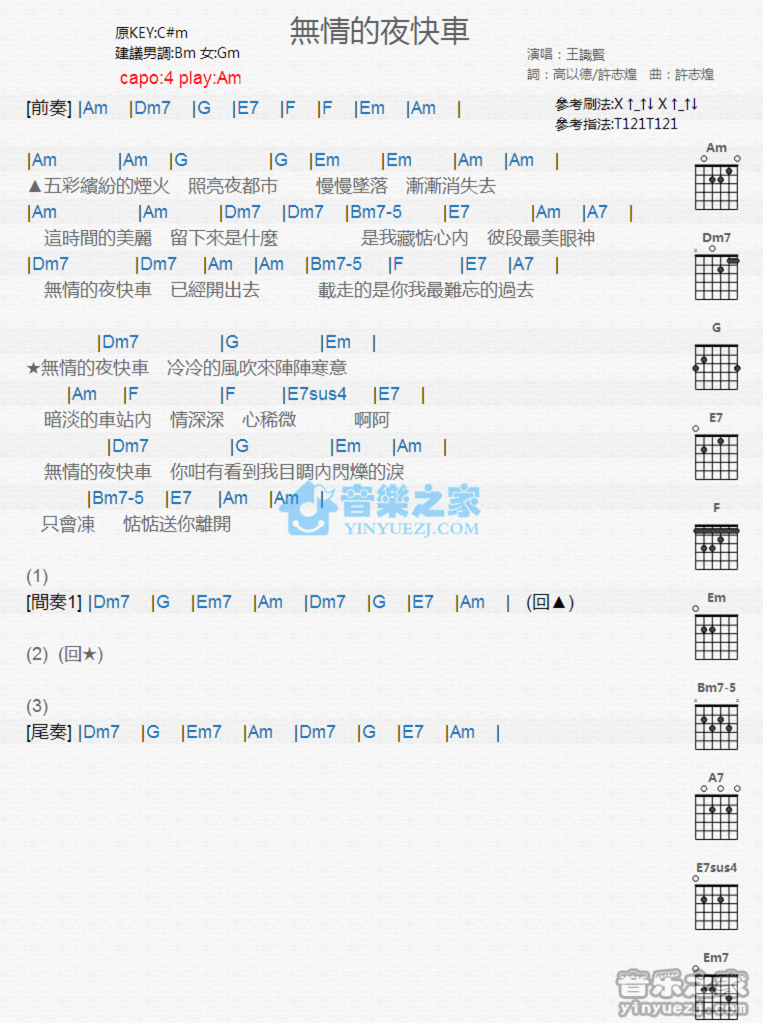 曲谱介绍: Am调版 王识贤《无情的夜快车》吉他和弦弹唱谱