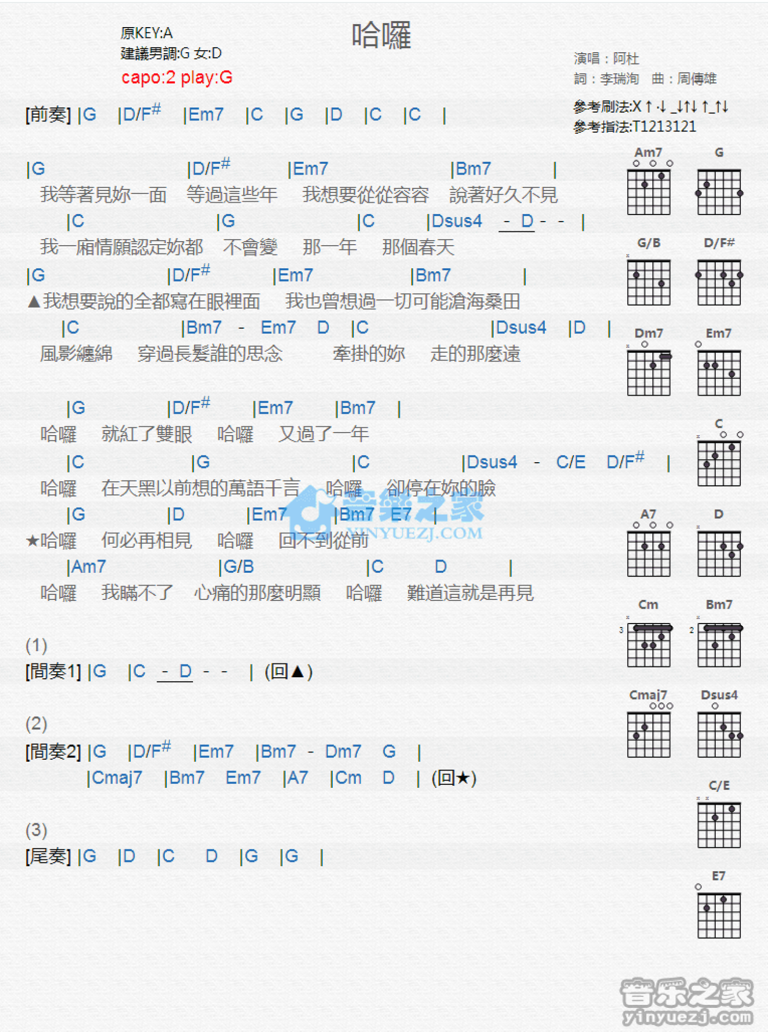 曲谱介绍: G调版 阿杜《哈芳拖业