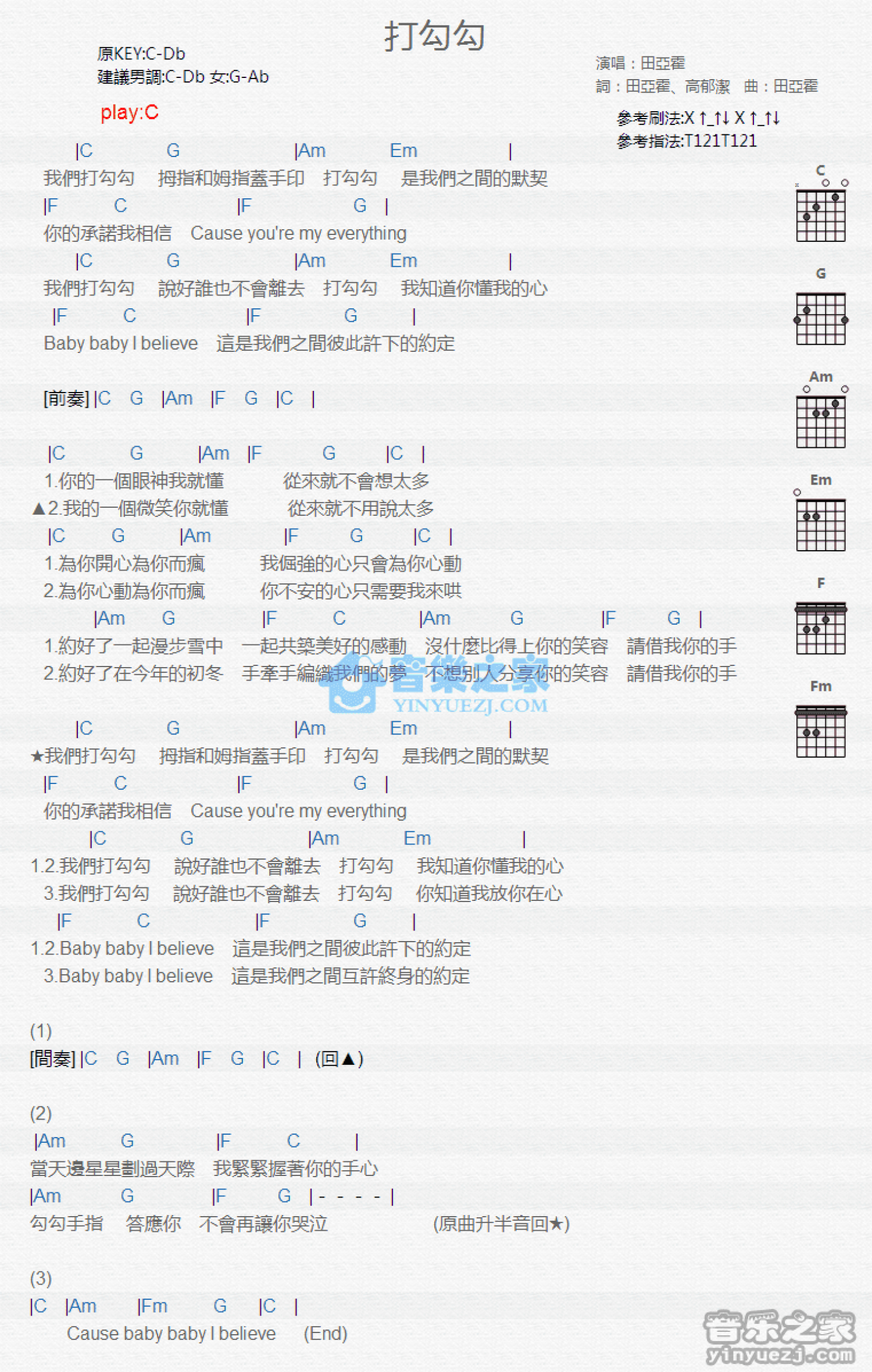 曲谱介绍: C调版 田亚霍《打勾勾》吉他和弦弹唱谱