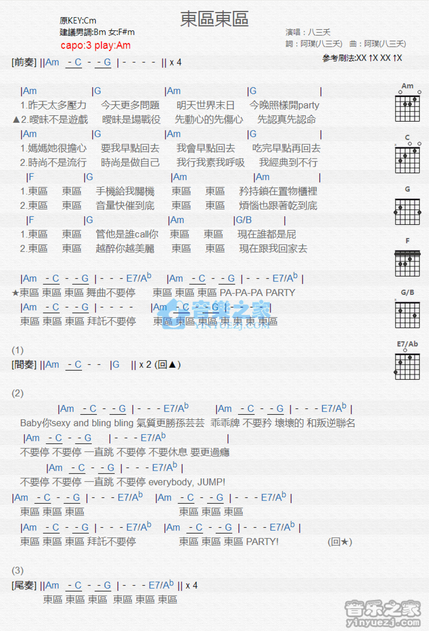 曲谱介绍: Am调版 八三夭《东区西区》吉他和弦弹唱谱