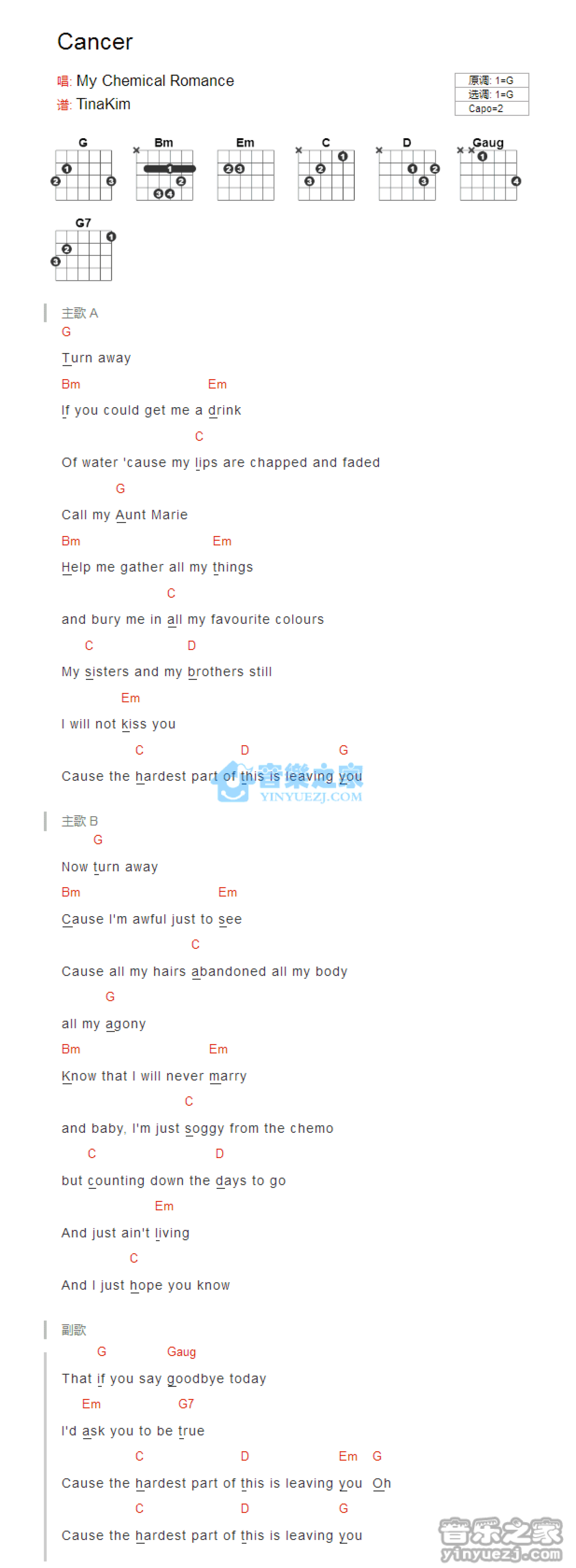 曲谱介绍: G调版 My Chemical Romance《Cancer》吉他和弦弹唱谱