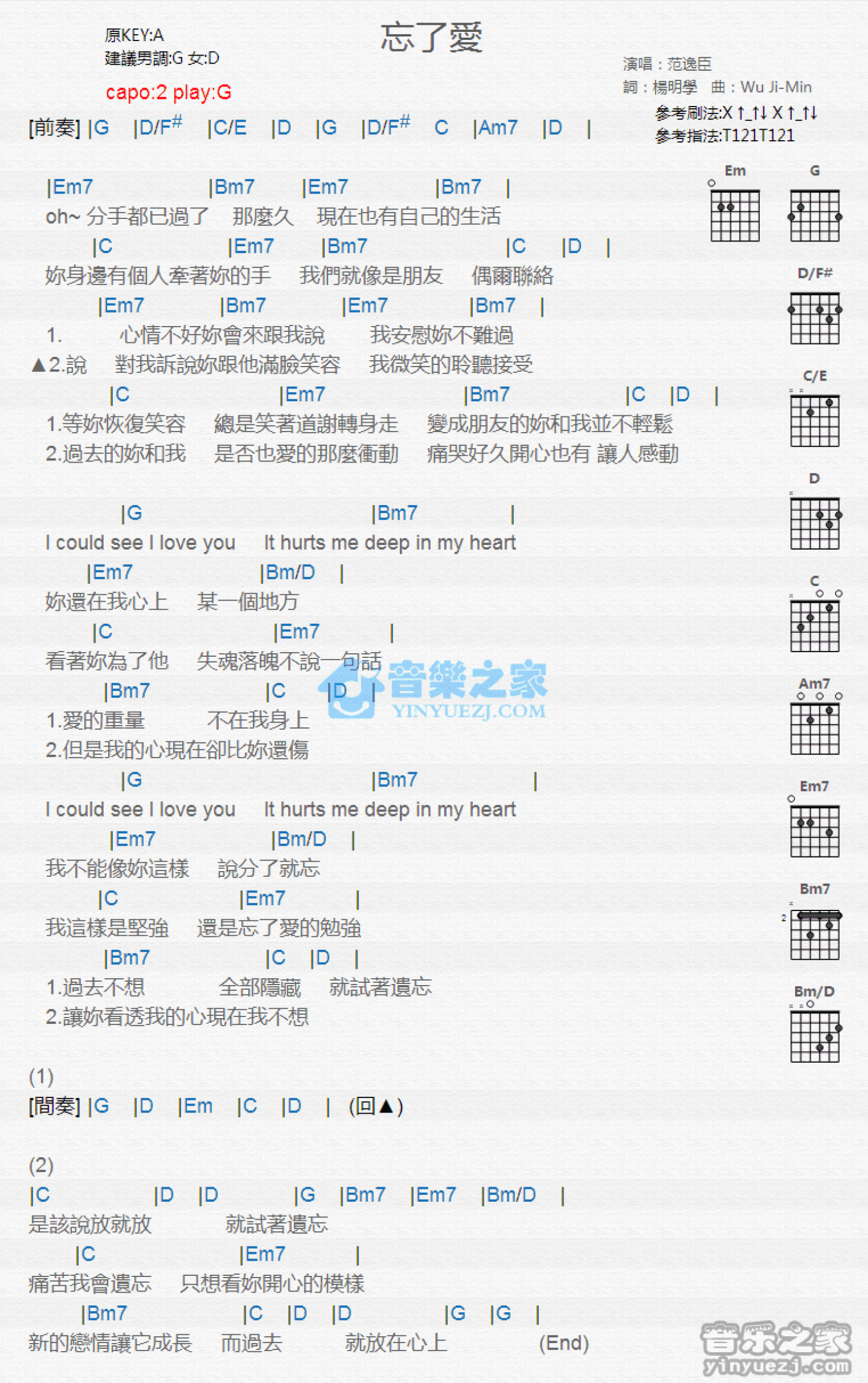 曲谱介绍: G调版 范逸臣《忘了爱》吉他和弦弹唱谱