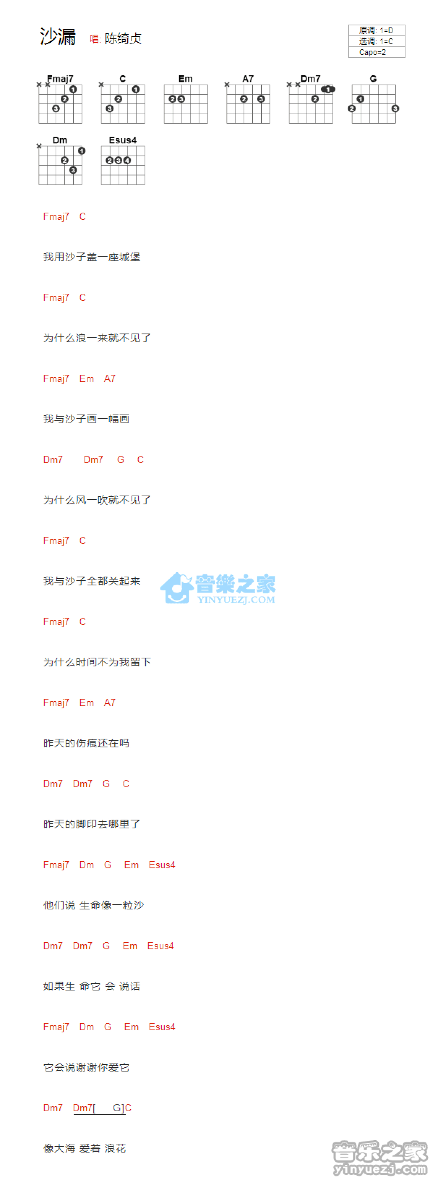 曲谱介绍: C调版 陈绮贞《沙漏》吉他和弦弹唱谱