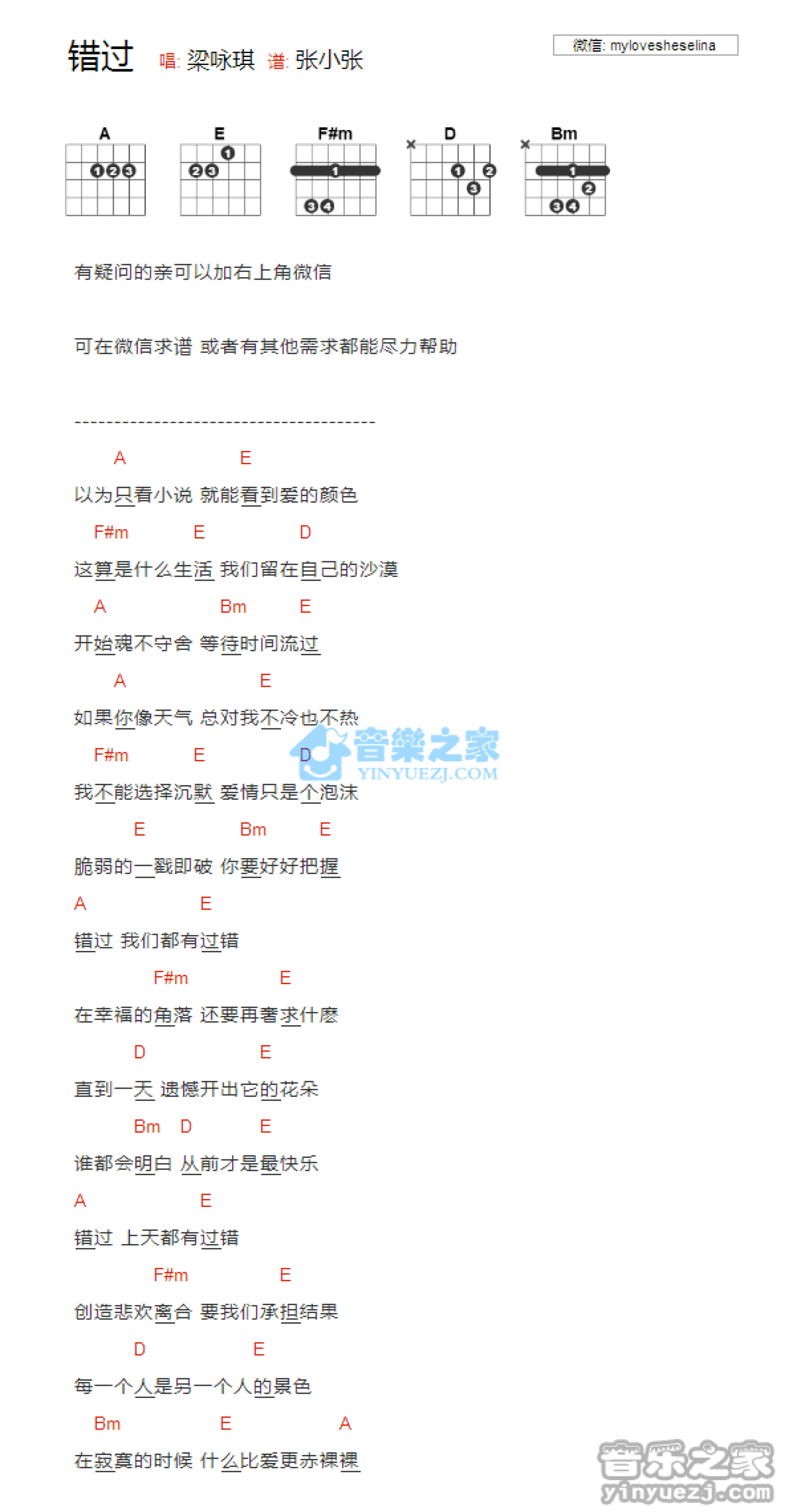曲谱介绍: 《错过》吉他和弦弹唱谱