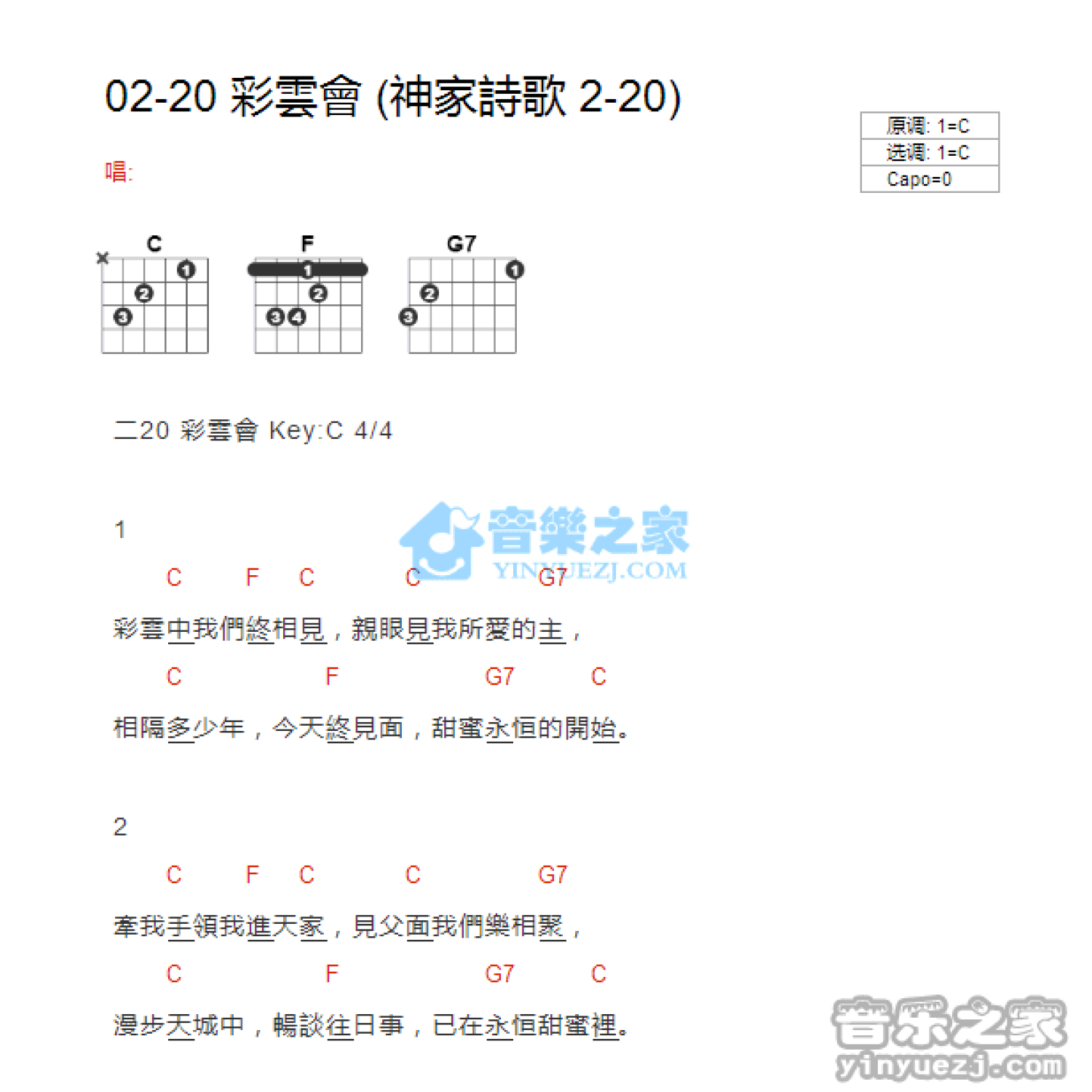 曲谱介绍: C调版 神家诗歌2-20《彩云会》吉他和弦弹唱谱