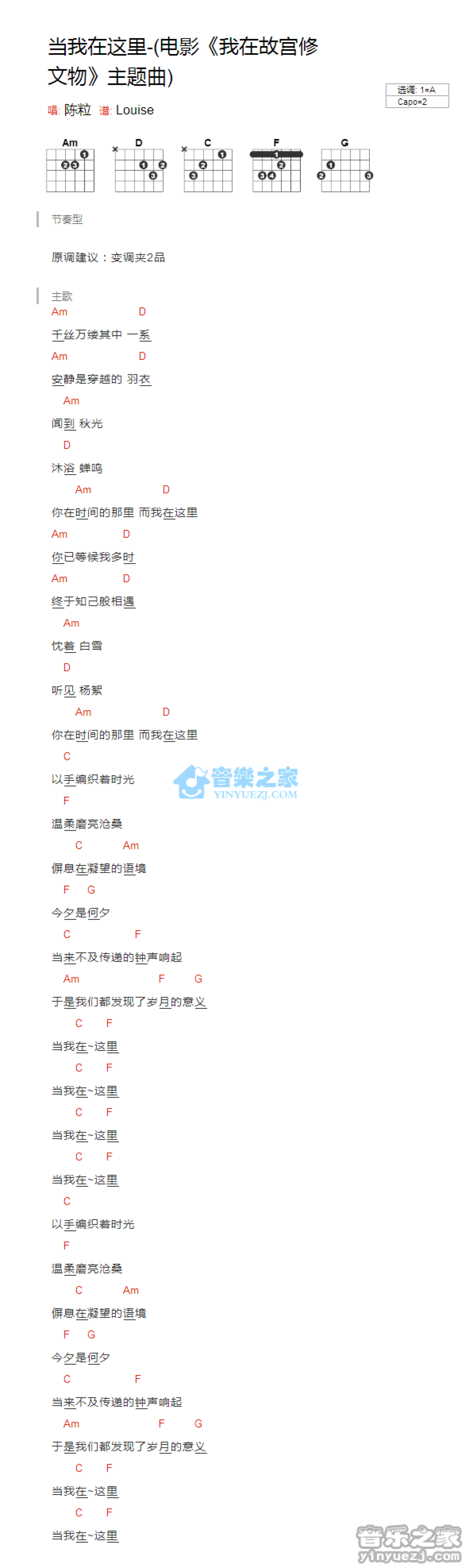 曲谱介绍: A调版 陈粒《当我在这里》吉他和弦弹唱谱