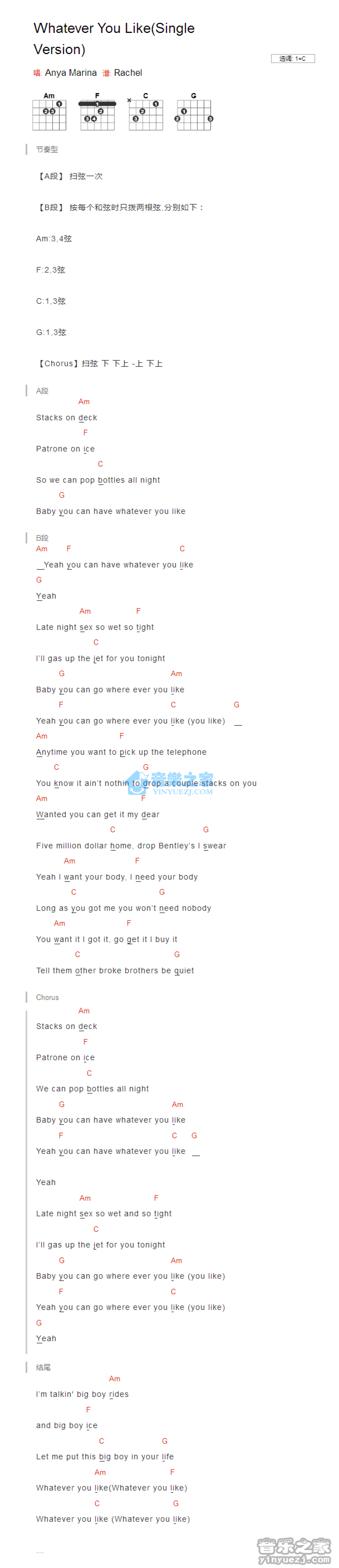 曲谱介绍: C调版 Anya Marina《Whatever You Like》吉他和弦弹唱谱