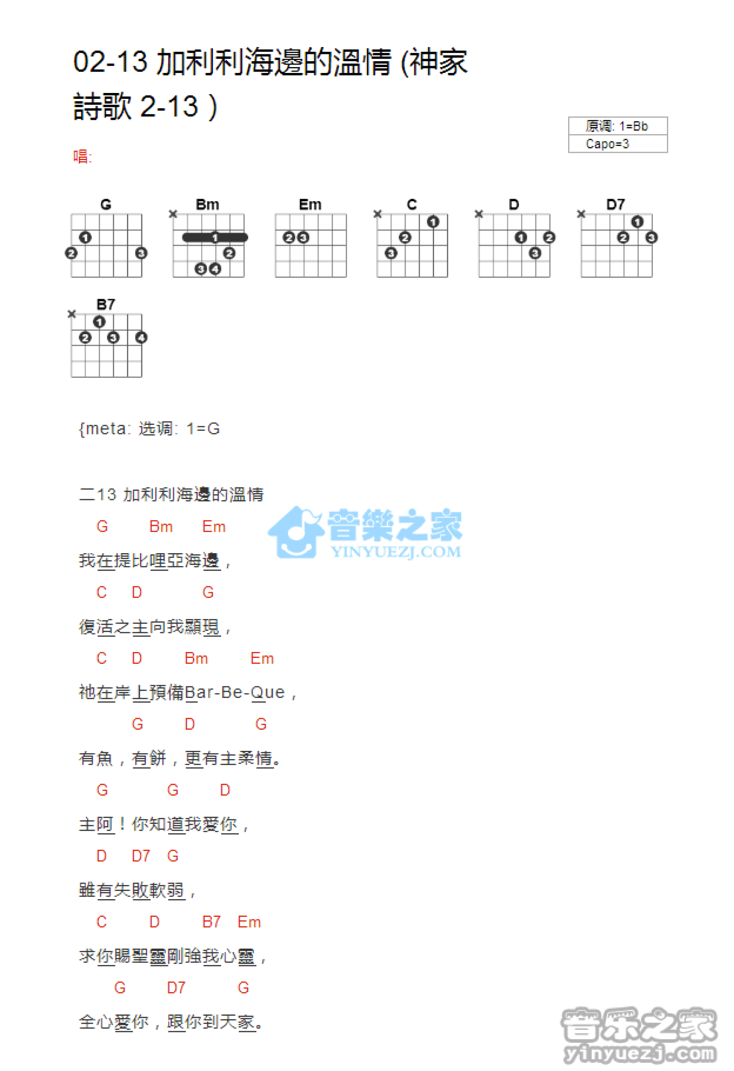 曲谱介绍: bB调版2-13《加利利海边的温情》吉他和弦弹唱谱