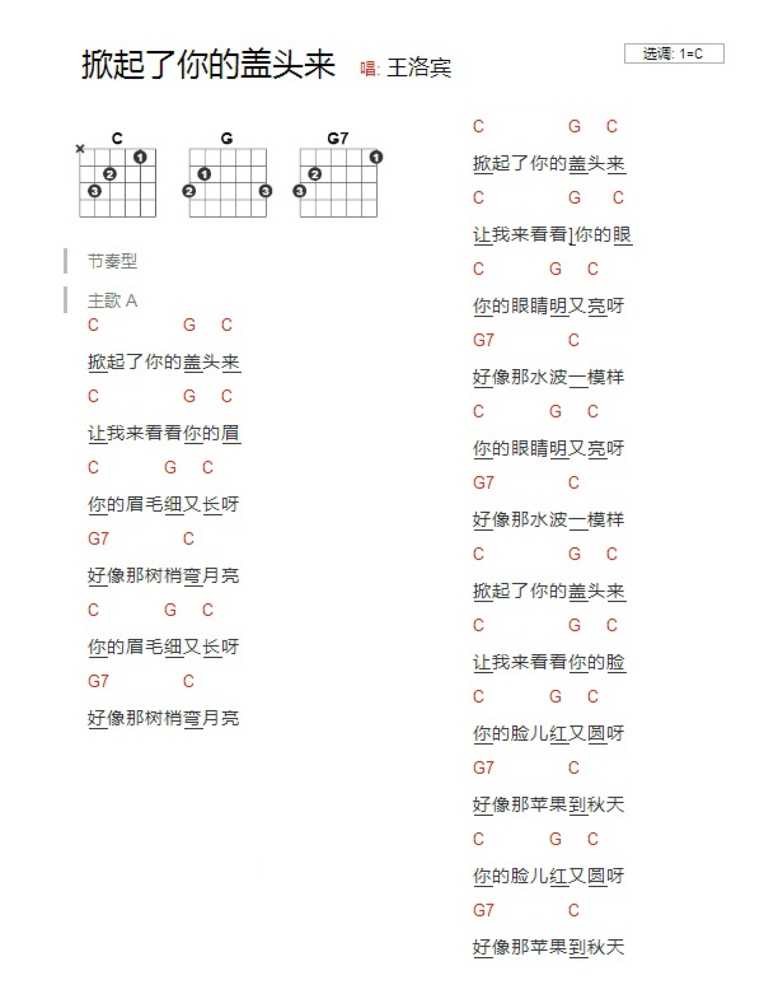 曲谱介绍: C调版 王洛宾《掀起了你的盖头来》吉他和弦弹唱谱