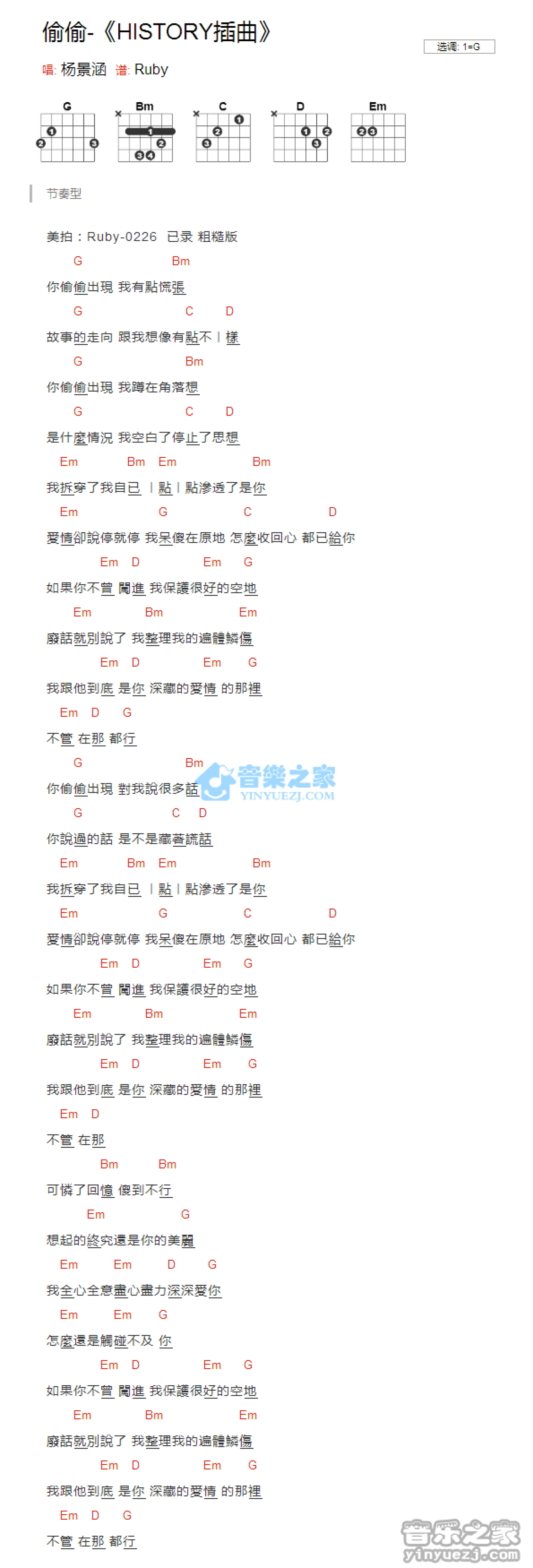 曲谱介绍: G调版 杨景涵《偷偷》吉他和弦弹唱谱