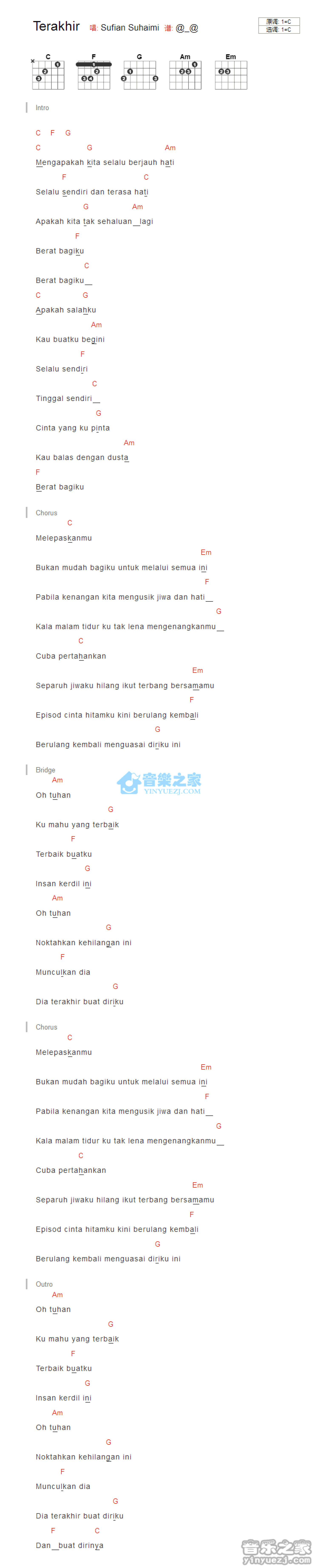 曲谱介绍: C调版 Sufian Suhaimi《Terakhir》吉他和弦弹唱谱