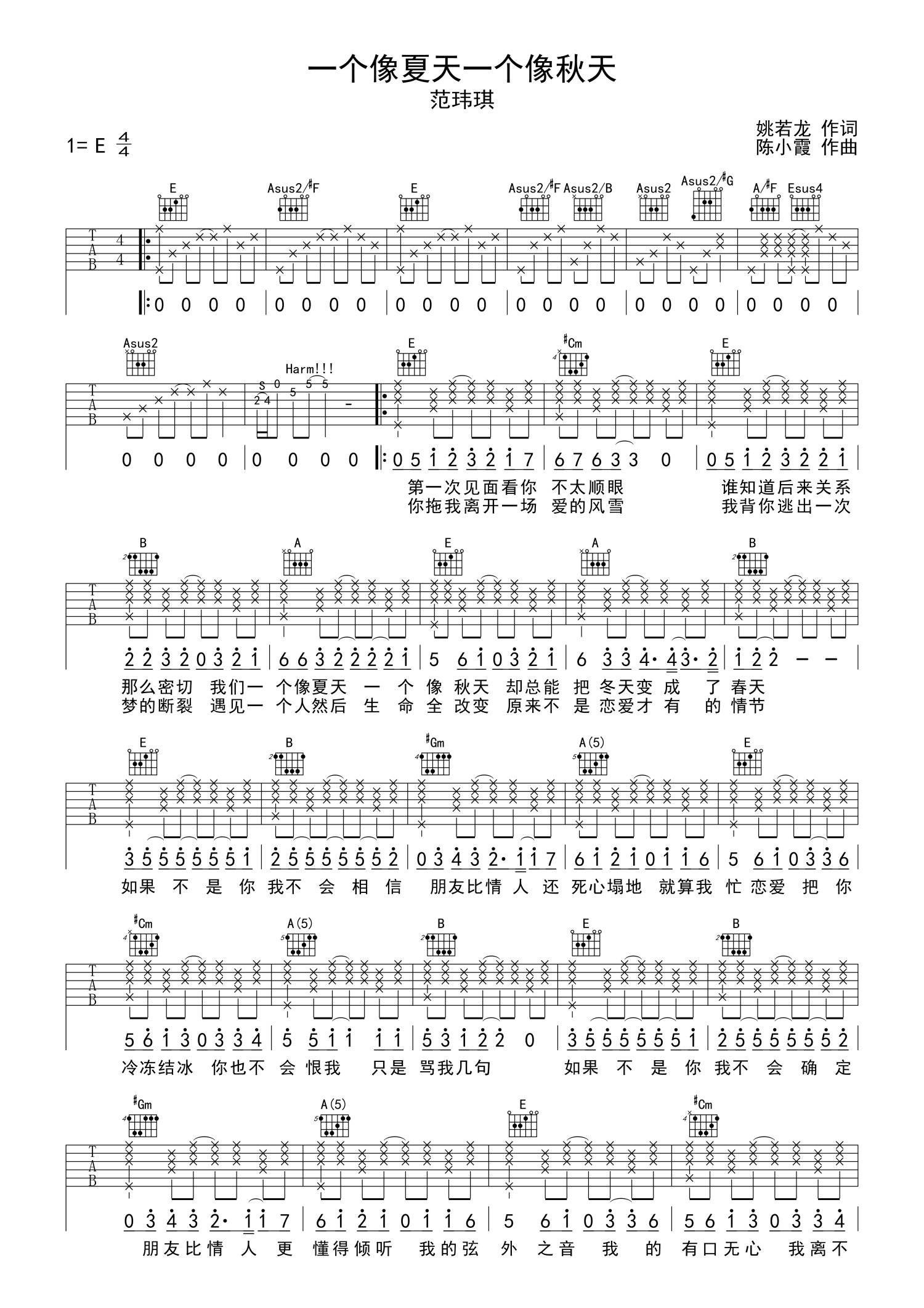 • 一个像夏天一个像秋天吉他谱 - 范玮琪 - E调吉他弹唱谱第1张