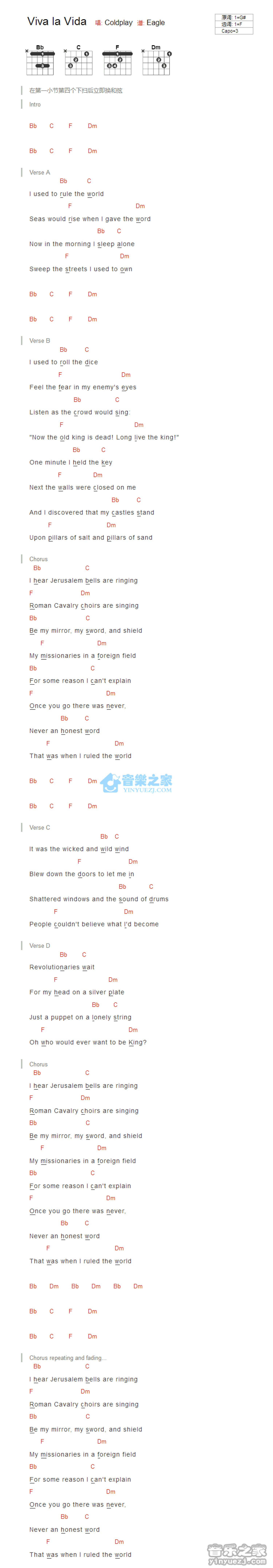曲谱介绍: F调版 Coldplay《Viva La Vida》吉他和弦弹唱谱