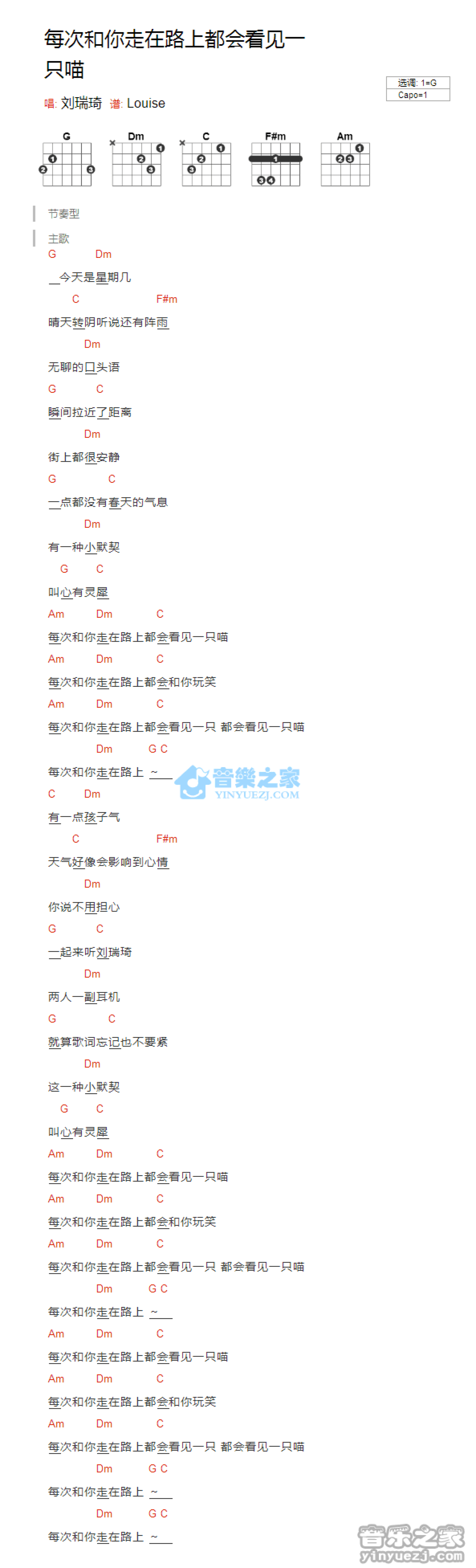 曲谱介绍: G调版《每次和你走在路上都会看见一只喵》吉他和弦弹唱谱