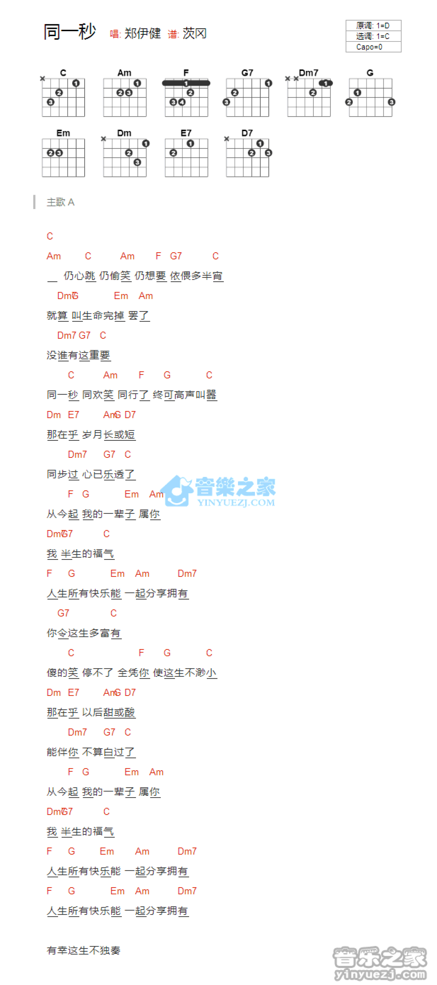 曲谱介绍: C调版 郑伊健《同一秒》吉他和弦弹唱谱