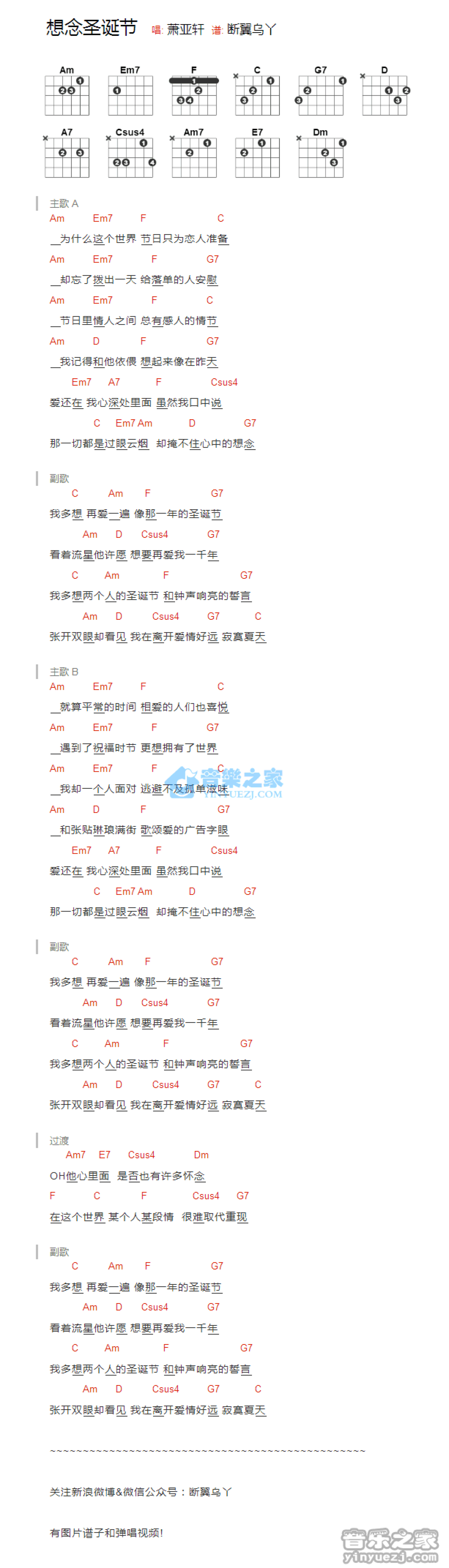曲谱介绍: 《想念圣诞节》吉他和弦弹唱谱