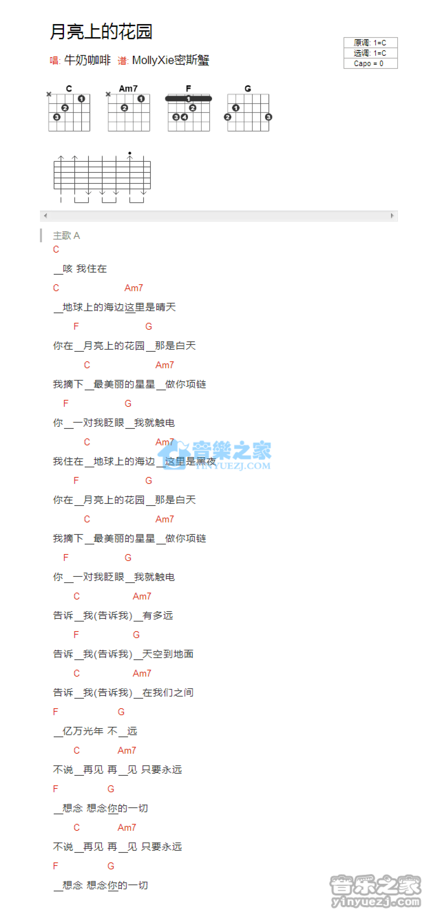 曲谱介绍: C调版 牛奶咖啡《月亮上的花园》吉他和弦弹唱谱