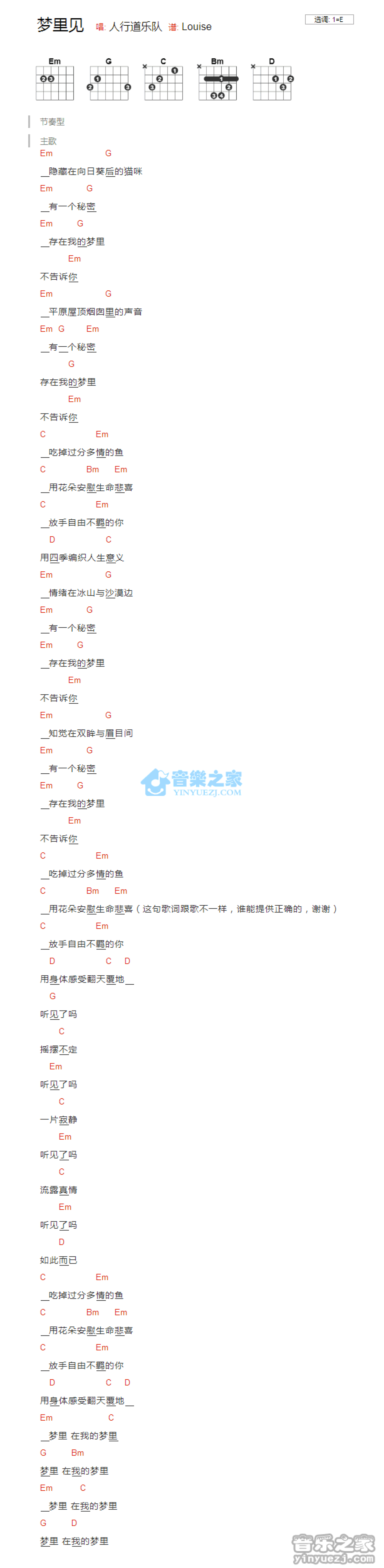 曲谱介绍: E调版 人行道乐队《梦里见》吉他和弦弹唱谱