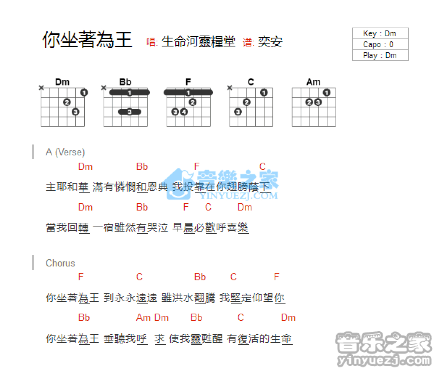 曲谱介绍: Dm调版生命河灵粮堂《你坐着为王》吉他和弦弹唱谱