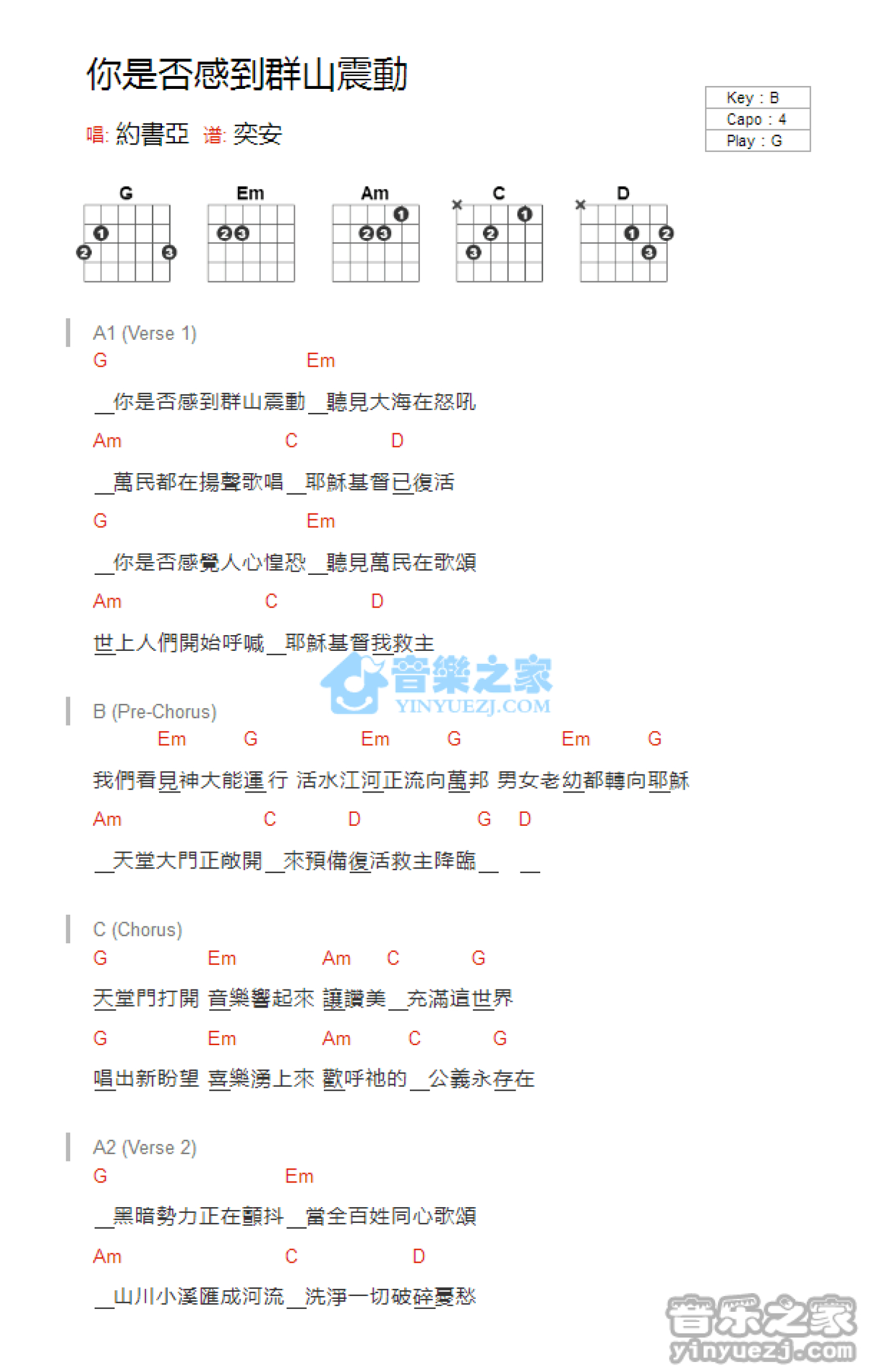 曲谱介绍: G调版约书亚《你是否感到群山震动》吉他和弦弹唱谱