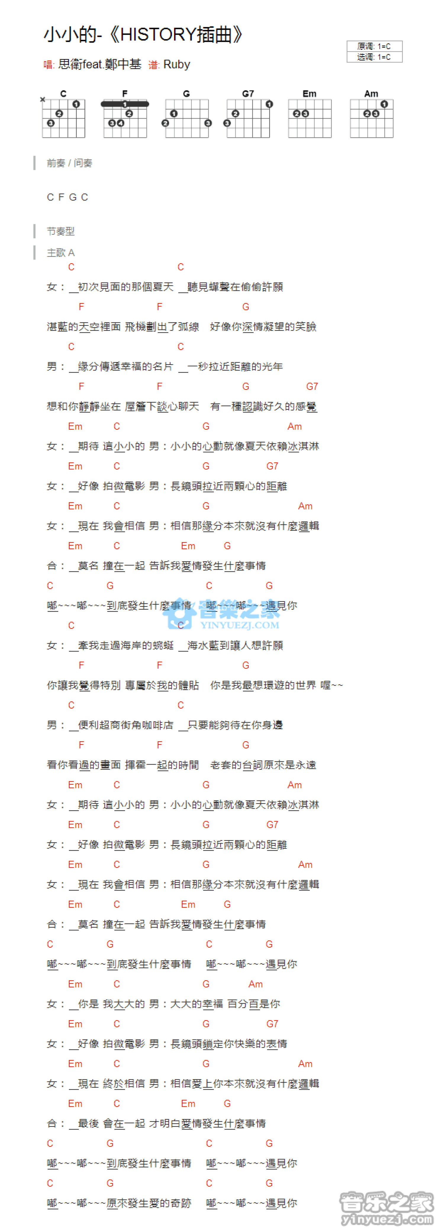 曲谱介绍: C调版 郑中基/思卫《小小的》吉他和弦弹唱谱