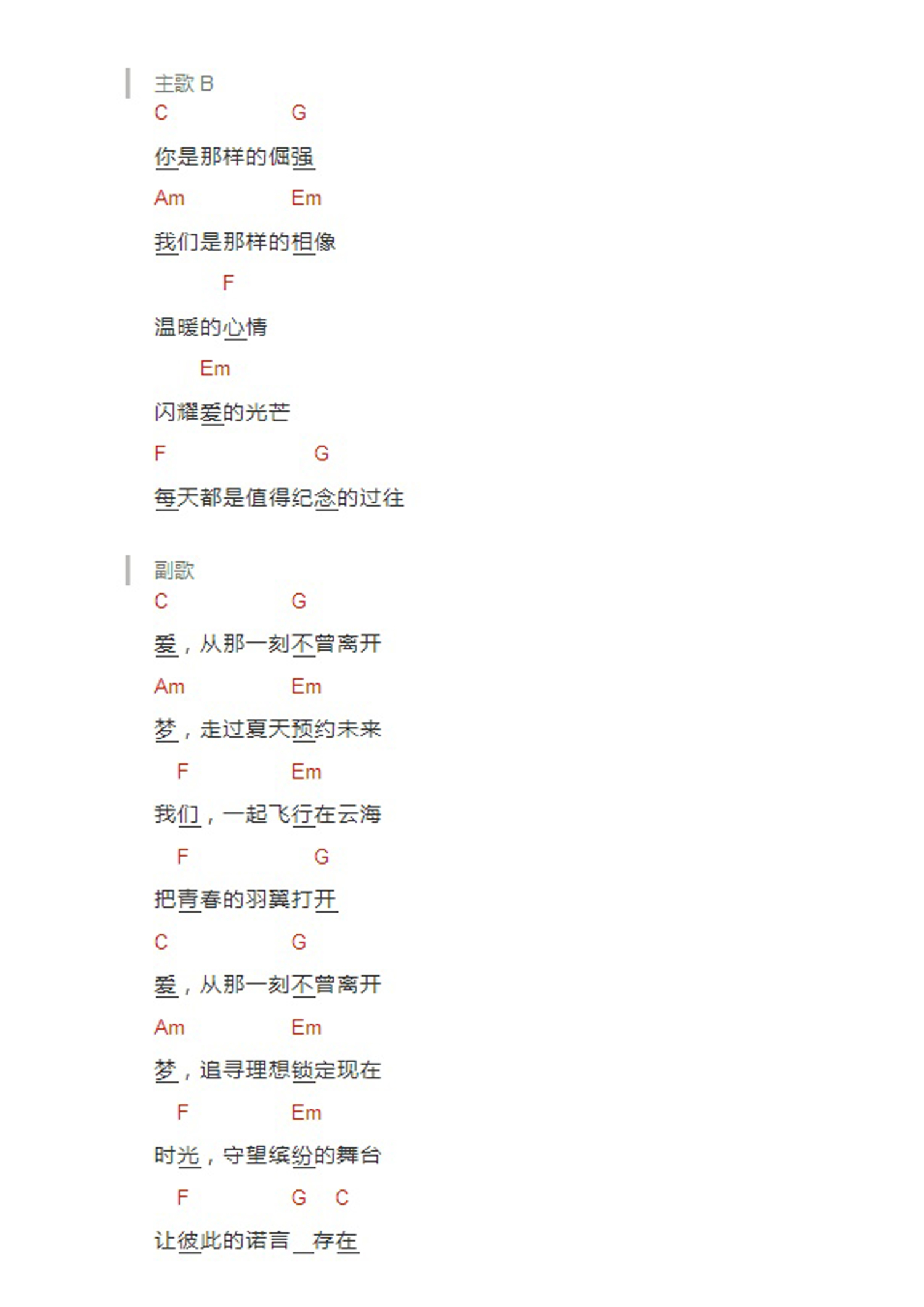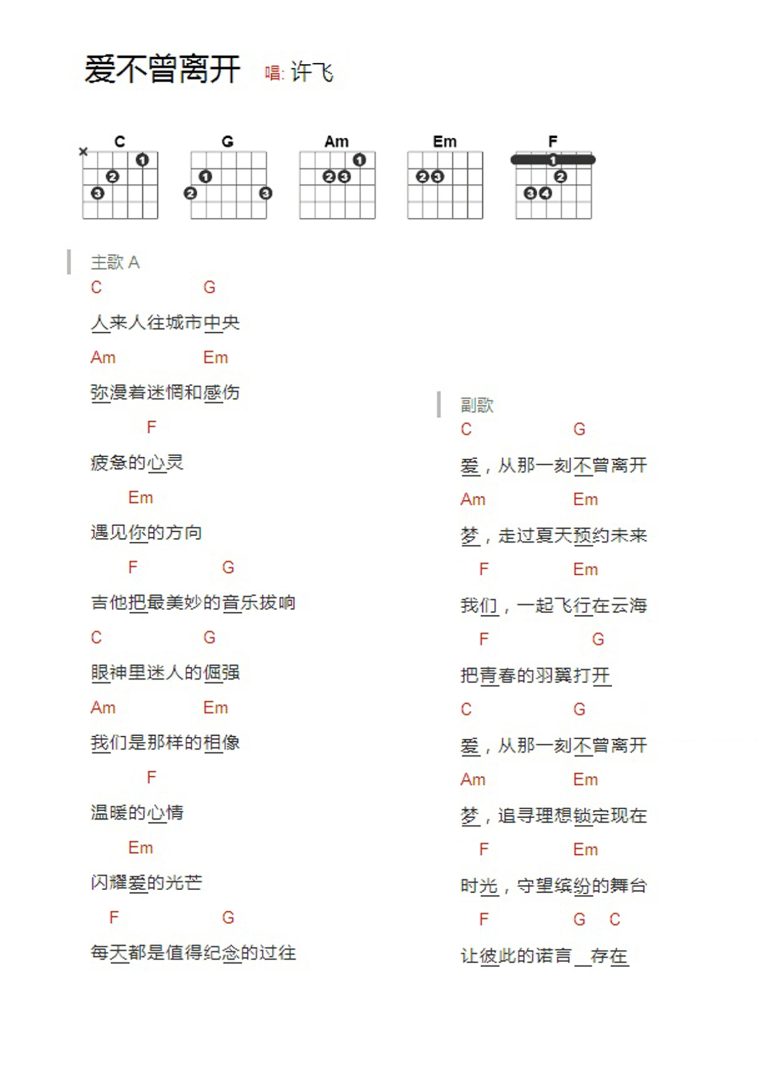 曲谱介绍: 许飞《爱不曾离开》吉他和弦弹唱谱