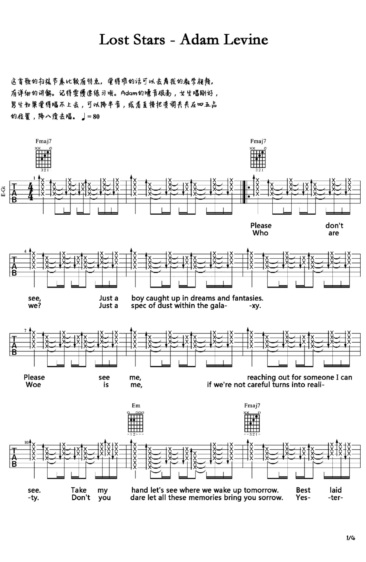 曲谱介绍: LostStars吉他谱,AdamLevine演唱,电影《Beginagain》插曲,这首歌曲的扫弦节奏比较有特点,觉得难的话可以去看我的教学视频,有详细的讲解。记得要慢速练习。原唱的嗓音很高,女生唱刚好,男生如果觉得唱不上去,可以降半音,或者直接把变调夹夹在四五品的位置,降八度去唱。一部平淡如水的电影,音乐是最动人的地方,推荐琴友们《Beginagain》也就是《歌曲改变人生/再次出发之纽约遇见你》。